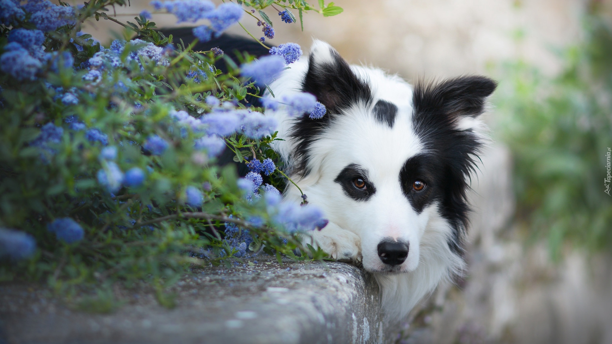 Edytor tapety: Border collie na krawężniku wśród kwiatów