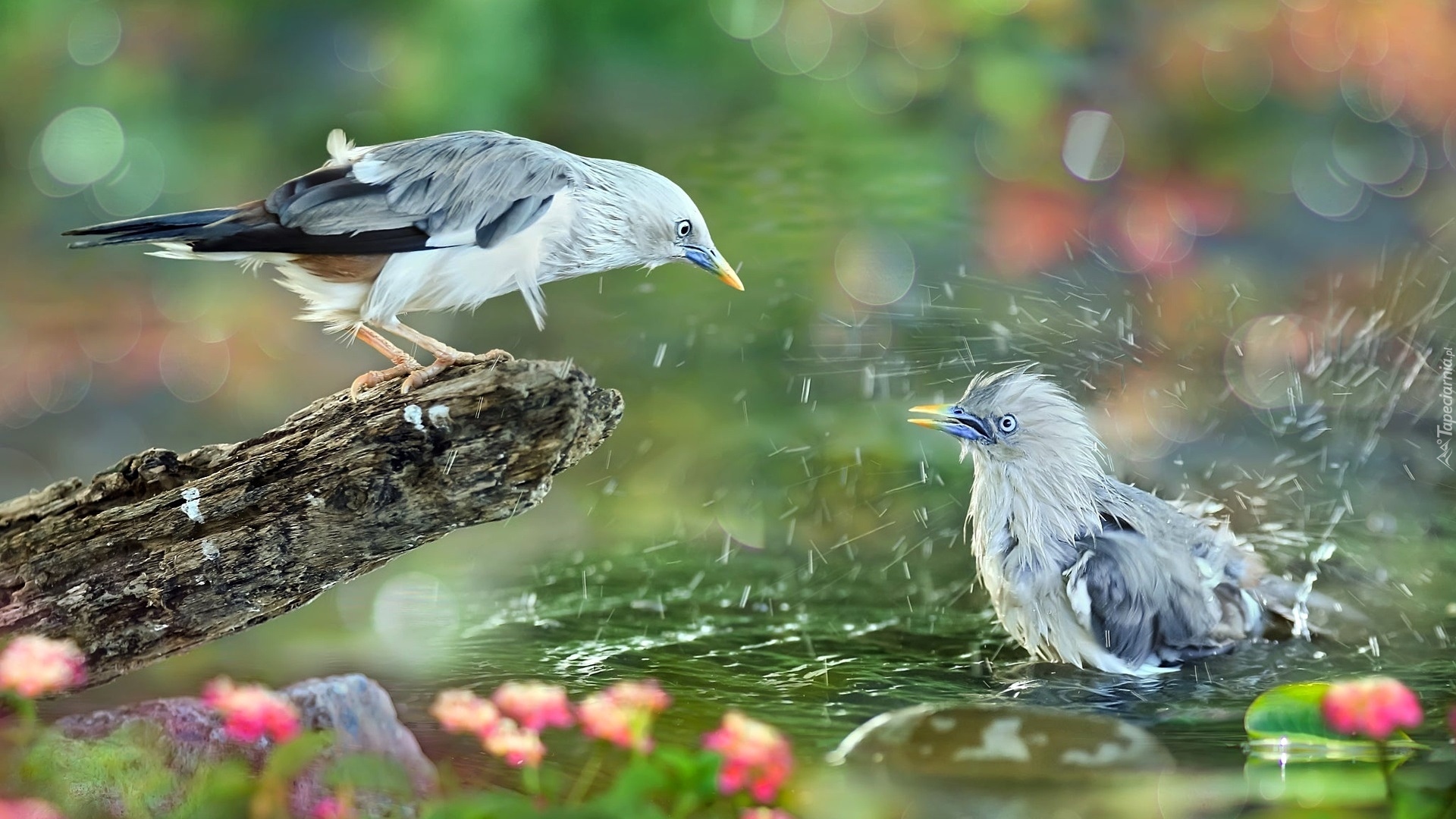 Edytor tapety: Niebiesko-szary ptak przyglądający się ptakowi w kąpieli