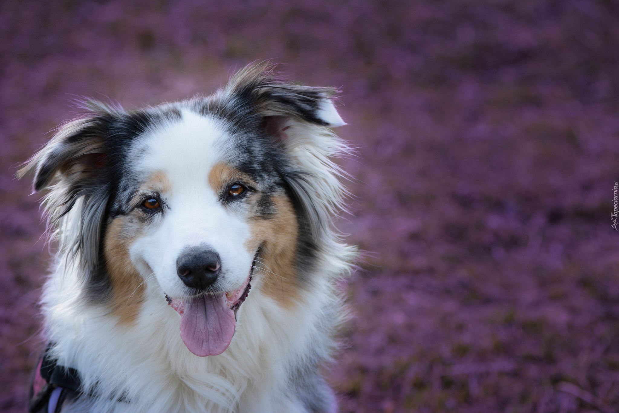 Edytor tapety: Owczarek australijski na tle rozmytych wrzosów