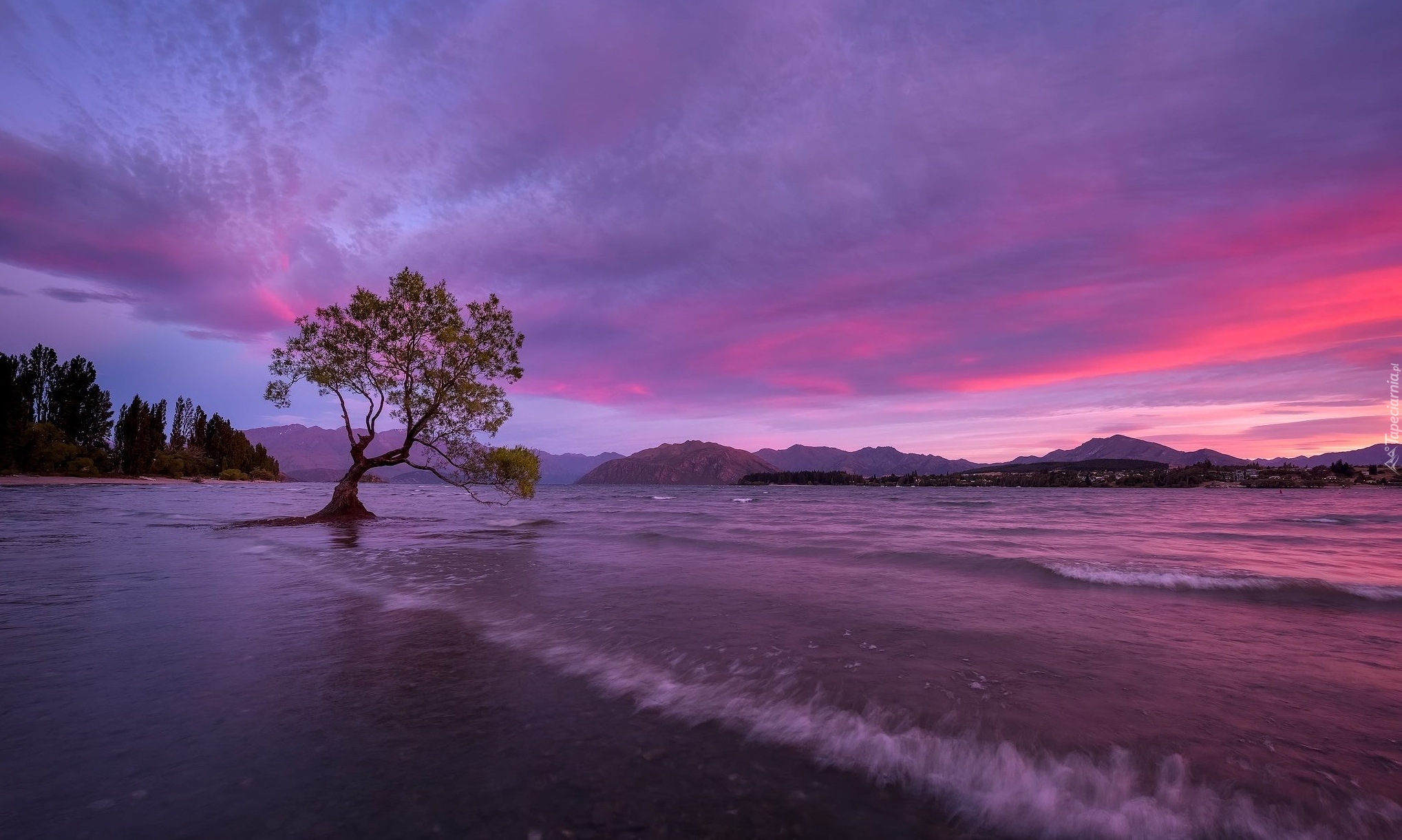 Edytor tapety: Pochylone drzewo na jeziorze Wanaka w Nowej Zelandii