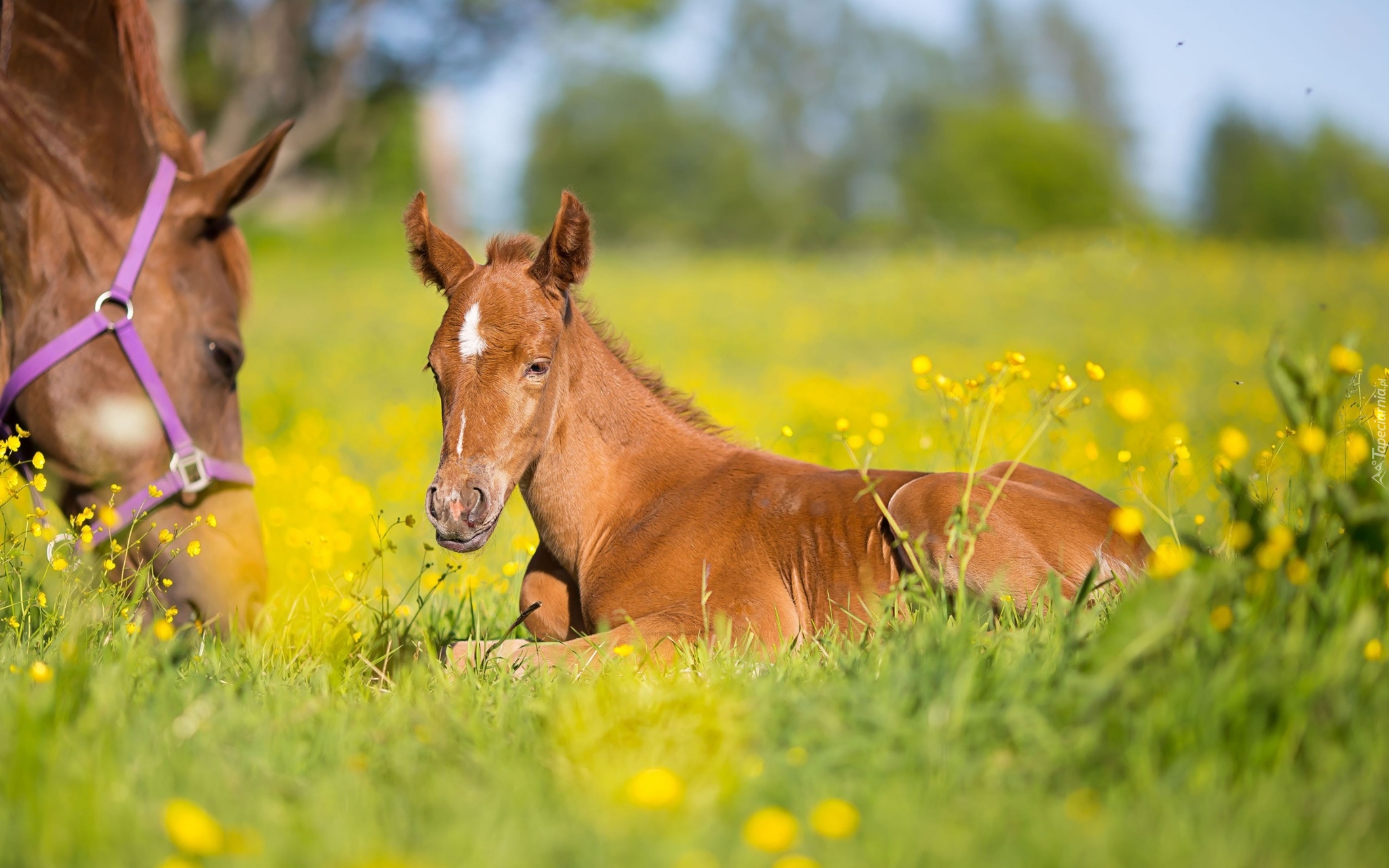 Edytor tapety: Źrebak wyleguje się na łące obok konia