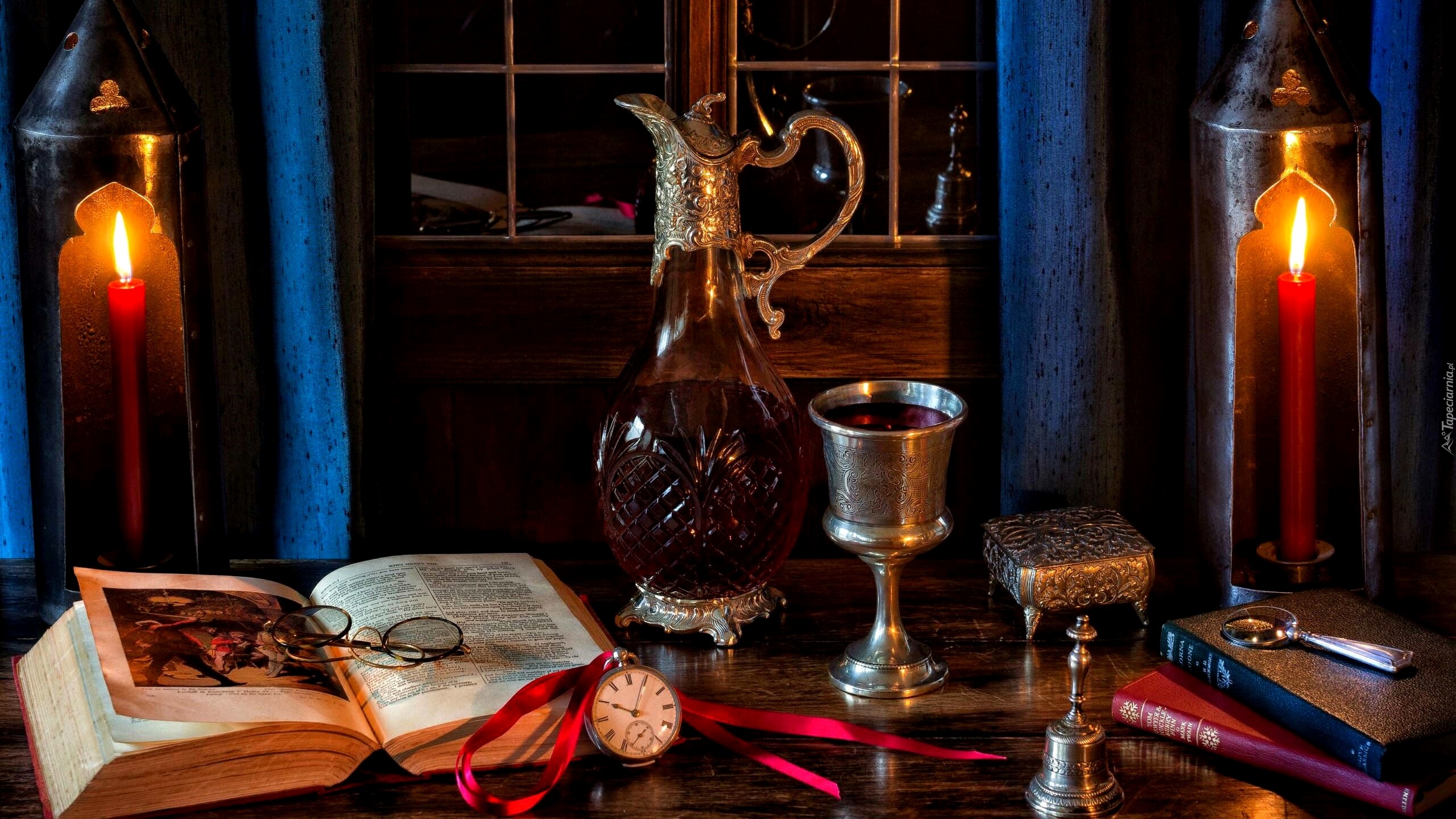 Edytor tapety: Kompozycja z lampionami, winem w karafce i książkami