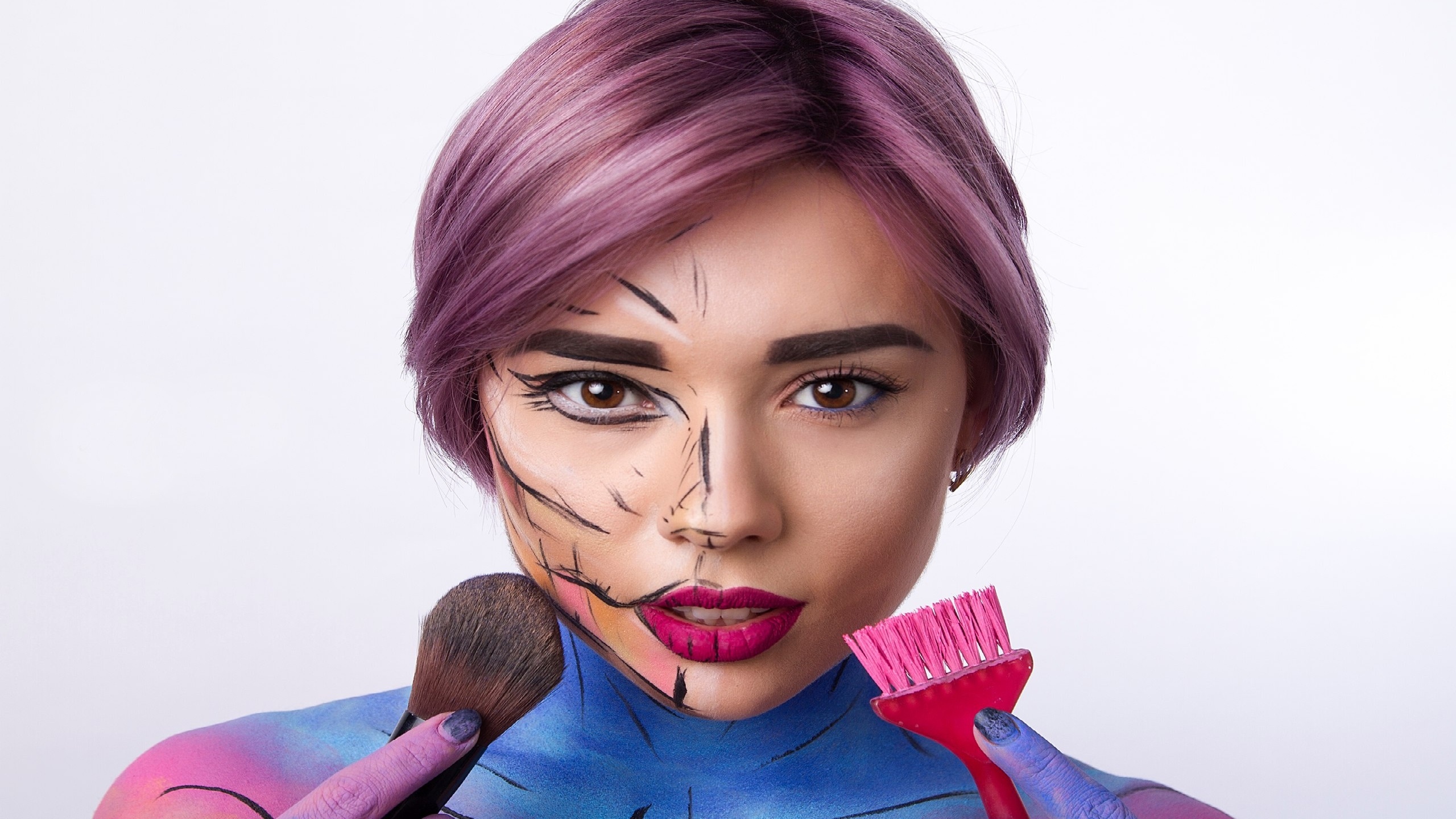 Edytor tapety: Kobieta z pędzelkami w dłoniach malująca twarz