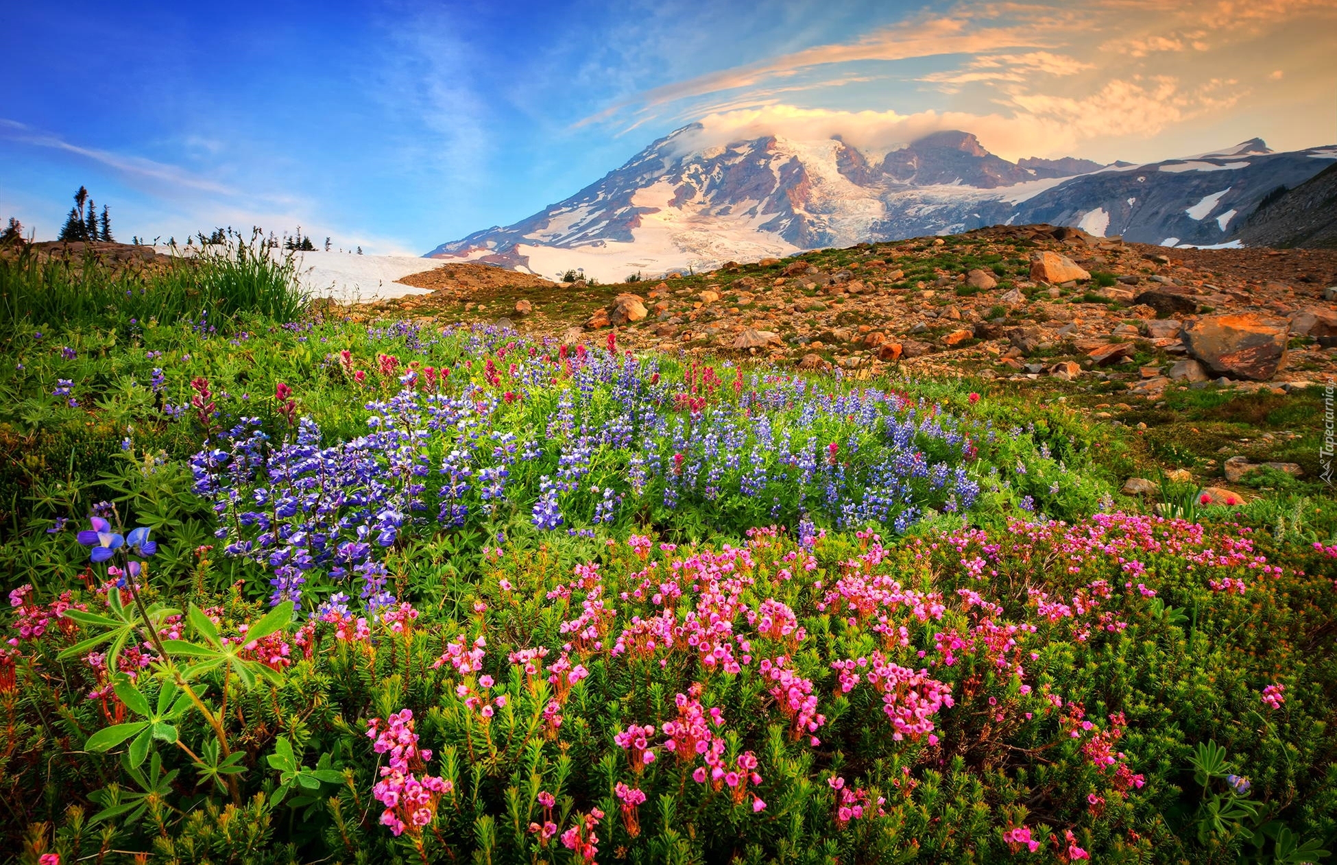 Edytor tapety: Widok z ukwieconej łąki na stratowulkan Mount Rainier