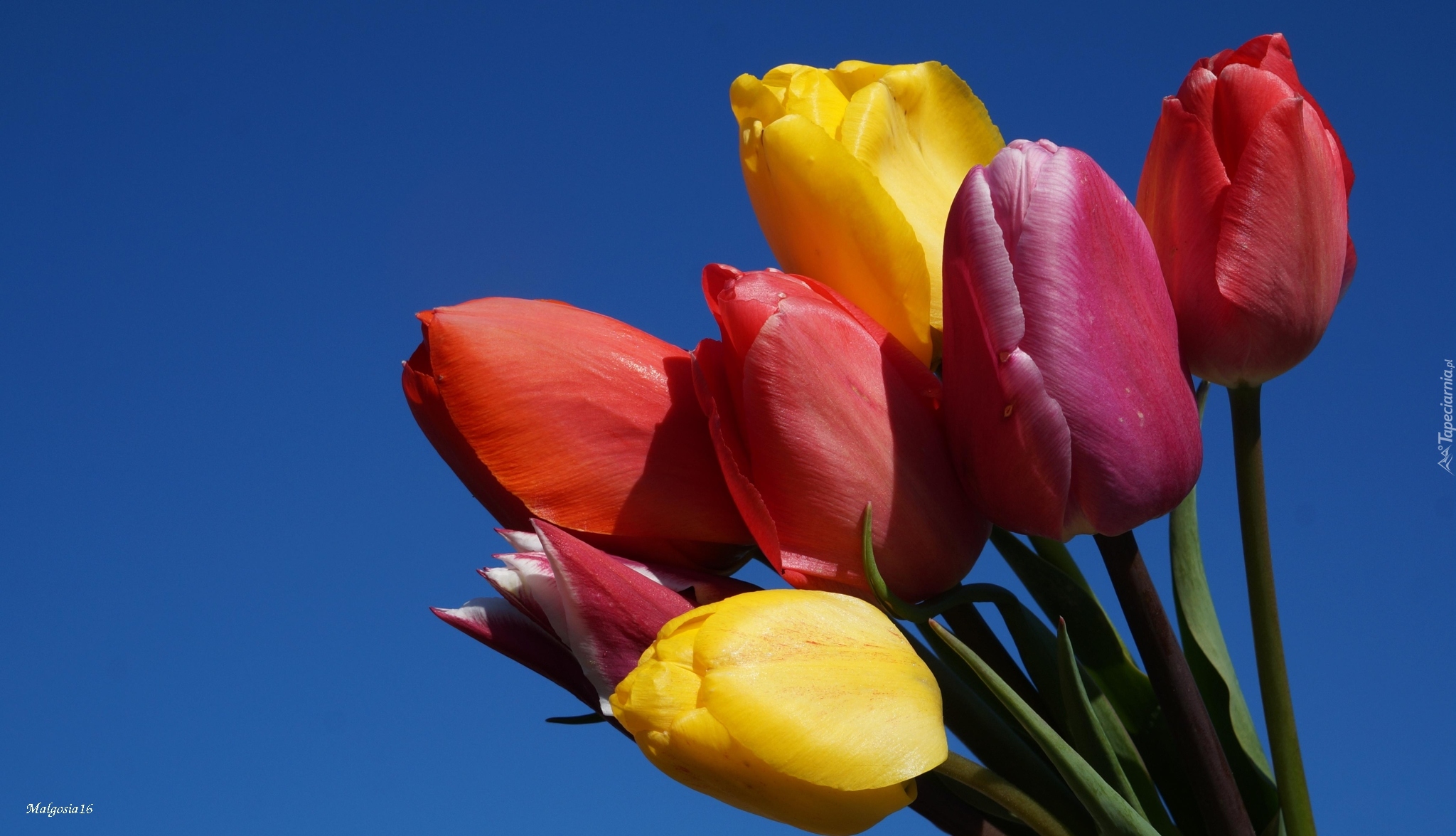 Edytor tapety: Bukiet kolorowych tulipanów na tle błękitnego nieba