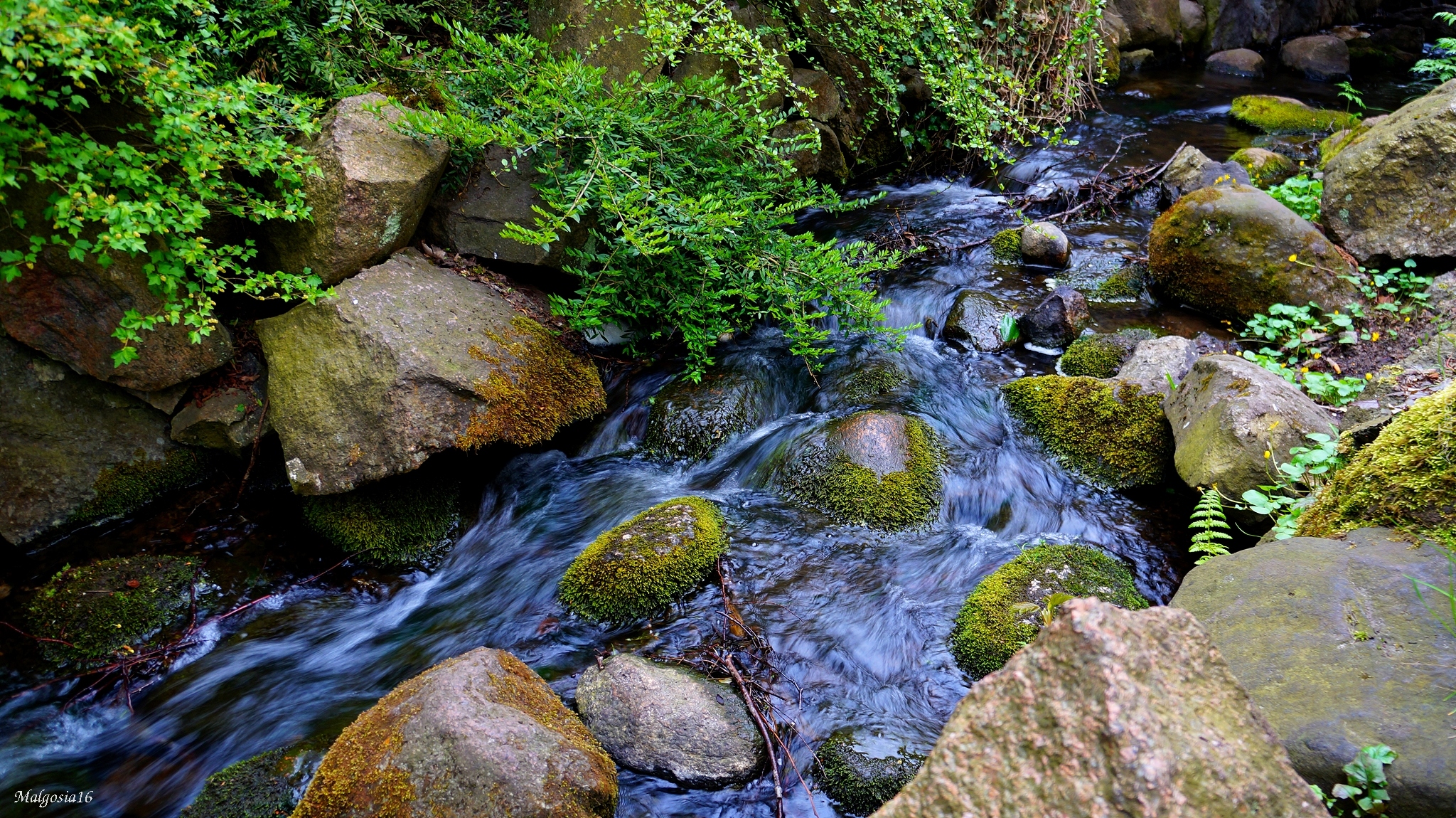 Edytor tapety: Strumyk płynący po omszałych kamieniach pośród roślinności