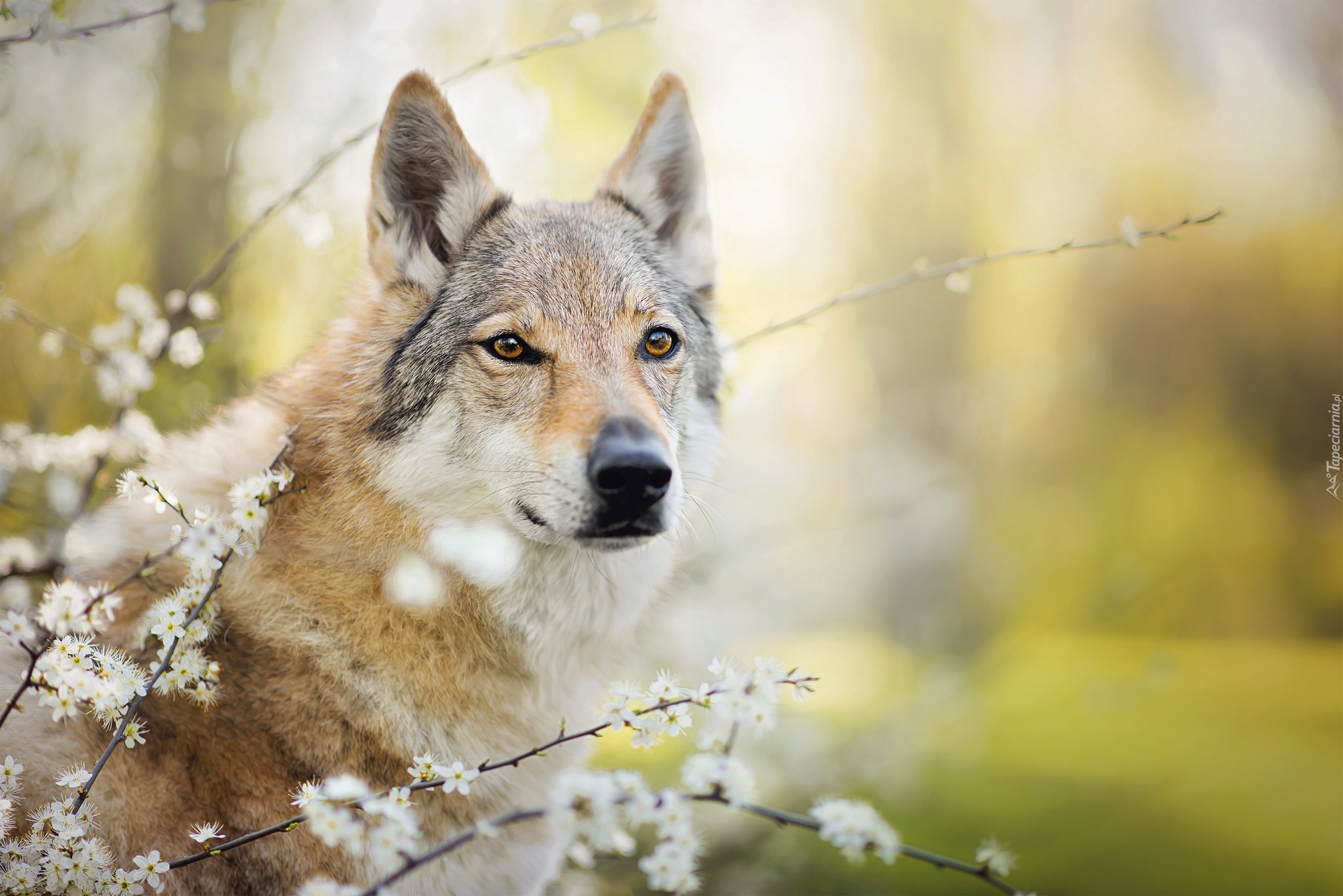 Edytor tapety: Wilczak czechosłowacki wygląda zza kwitnącej gałązki