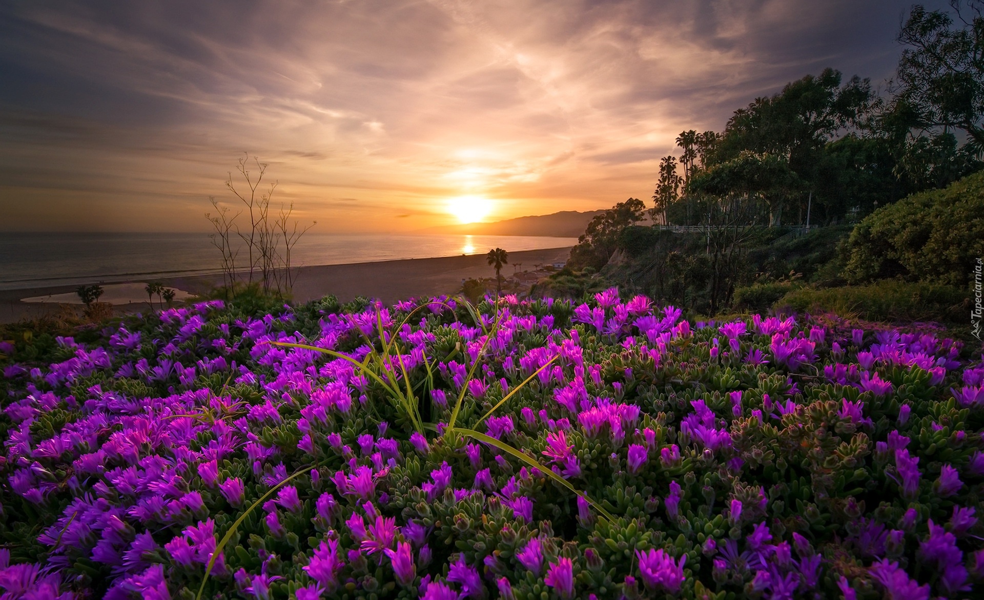 Edytor tapety: Ukwiecone wybrzeże oceanu w Malibu o zachodzie słońca