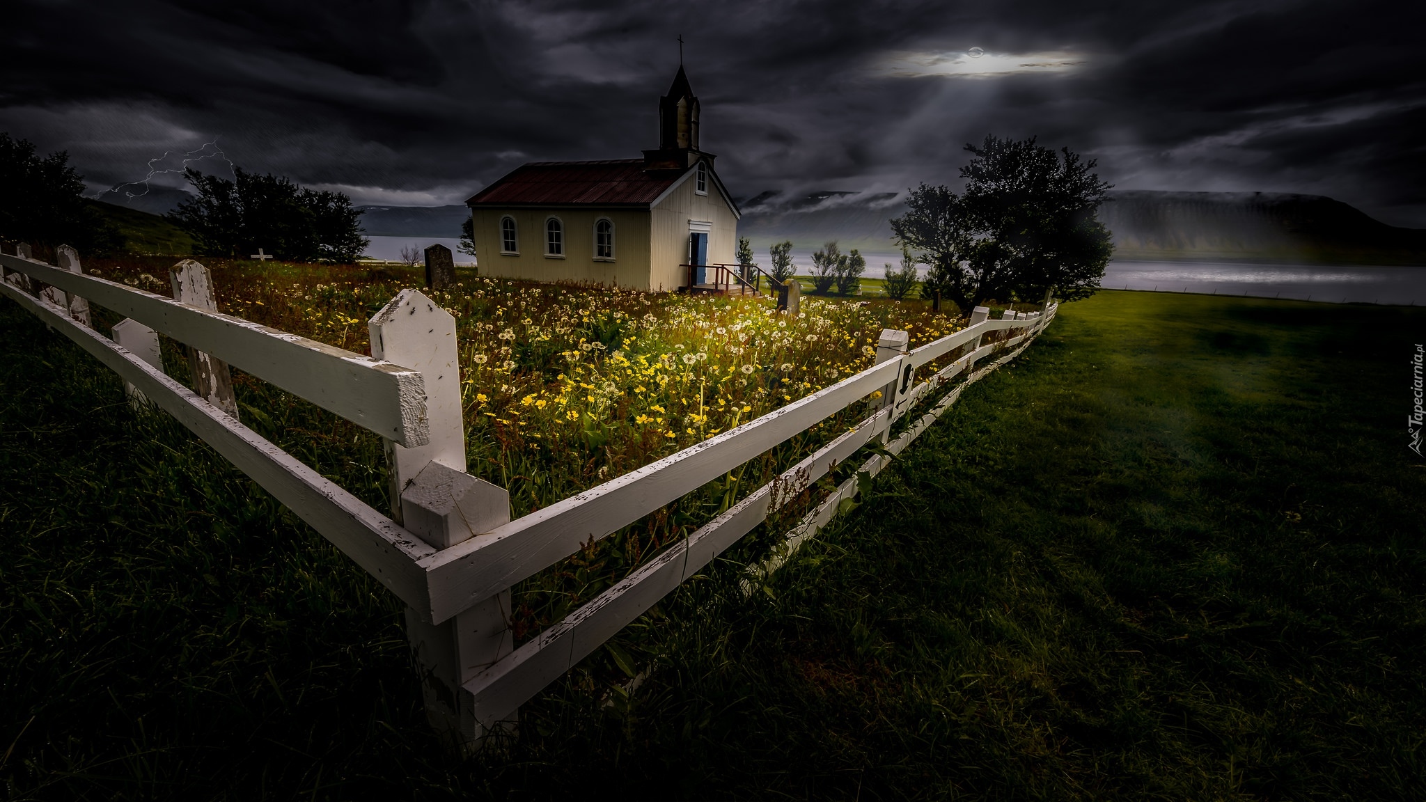 Edytor tapety: Burza nad kościółkiem i zaniedbanym ogrodzonym cmentarzem