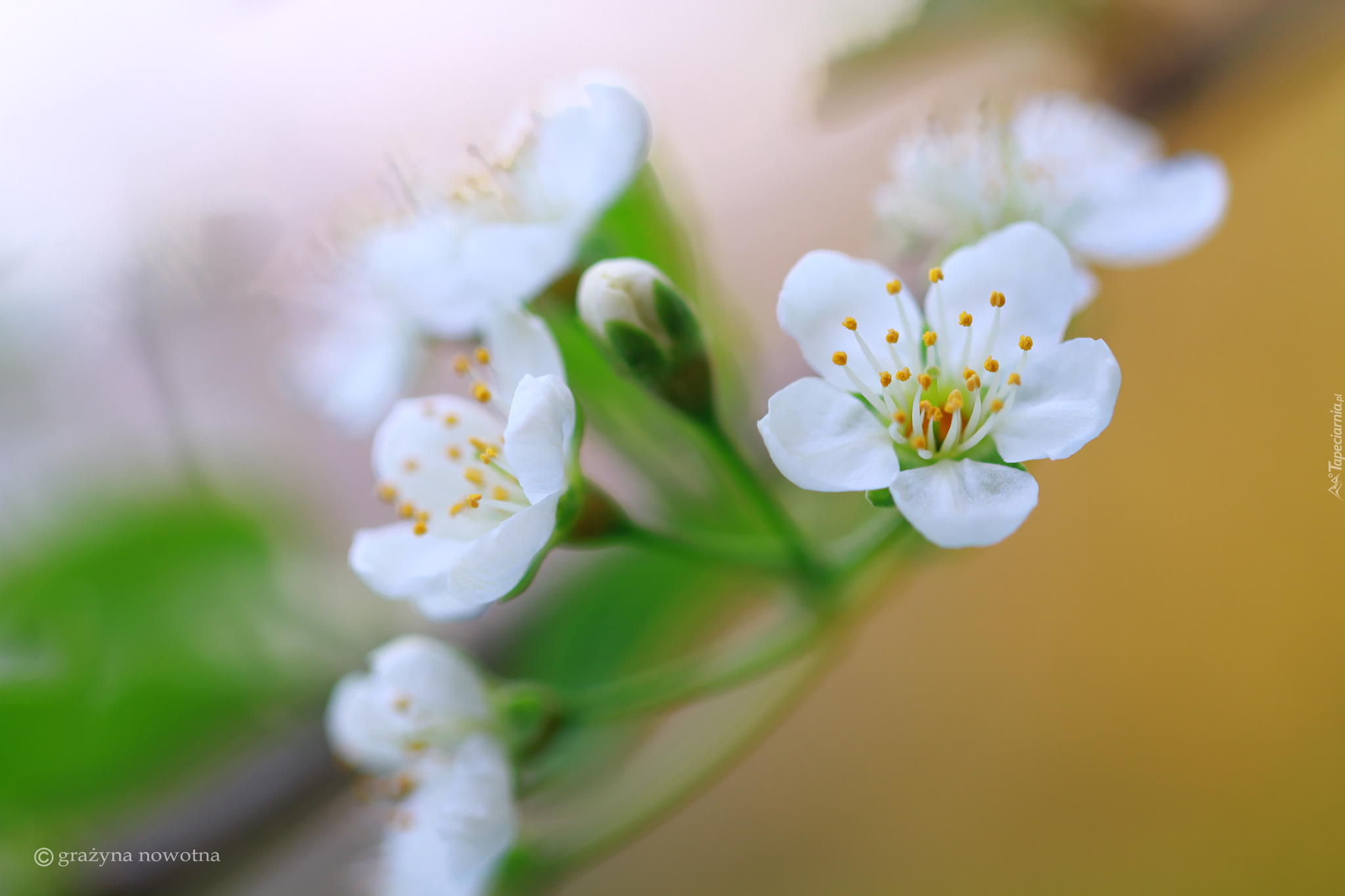 Edytor tapety: Gałązka drzewa owocowego z białymi kwiatami w rozmyciu