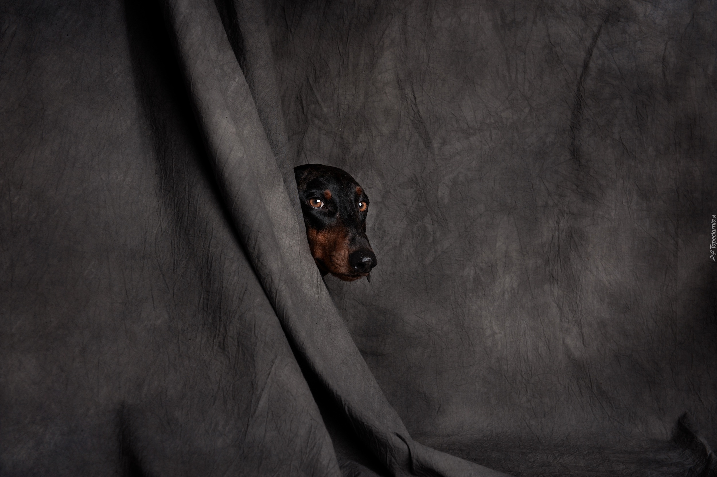 Edytor tapety: Głowa jamnika krótkowłosego spoglądającego zza kotary
