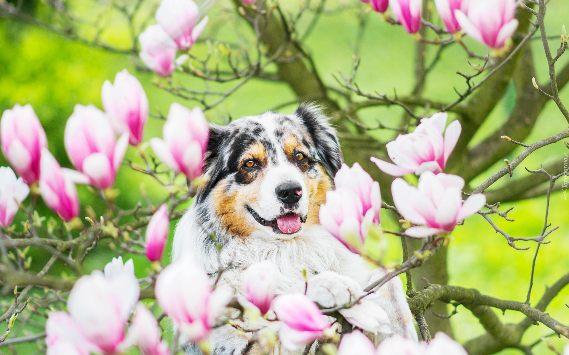 Edytor tapety: Kwiaty magnolii otaczające owczarka australijskiego