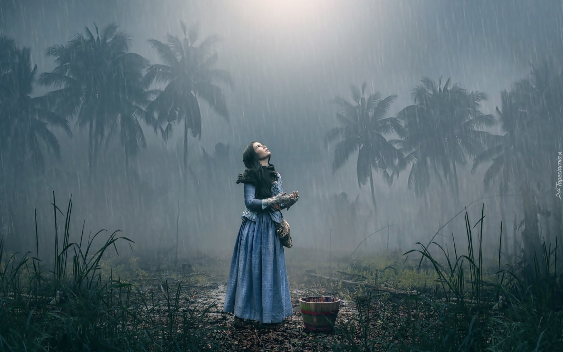 Edytor tapety: Deszcz zaskoczył dziewczynę w palmowym lesie