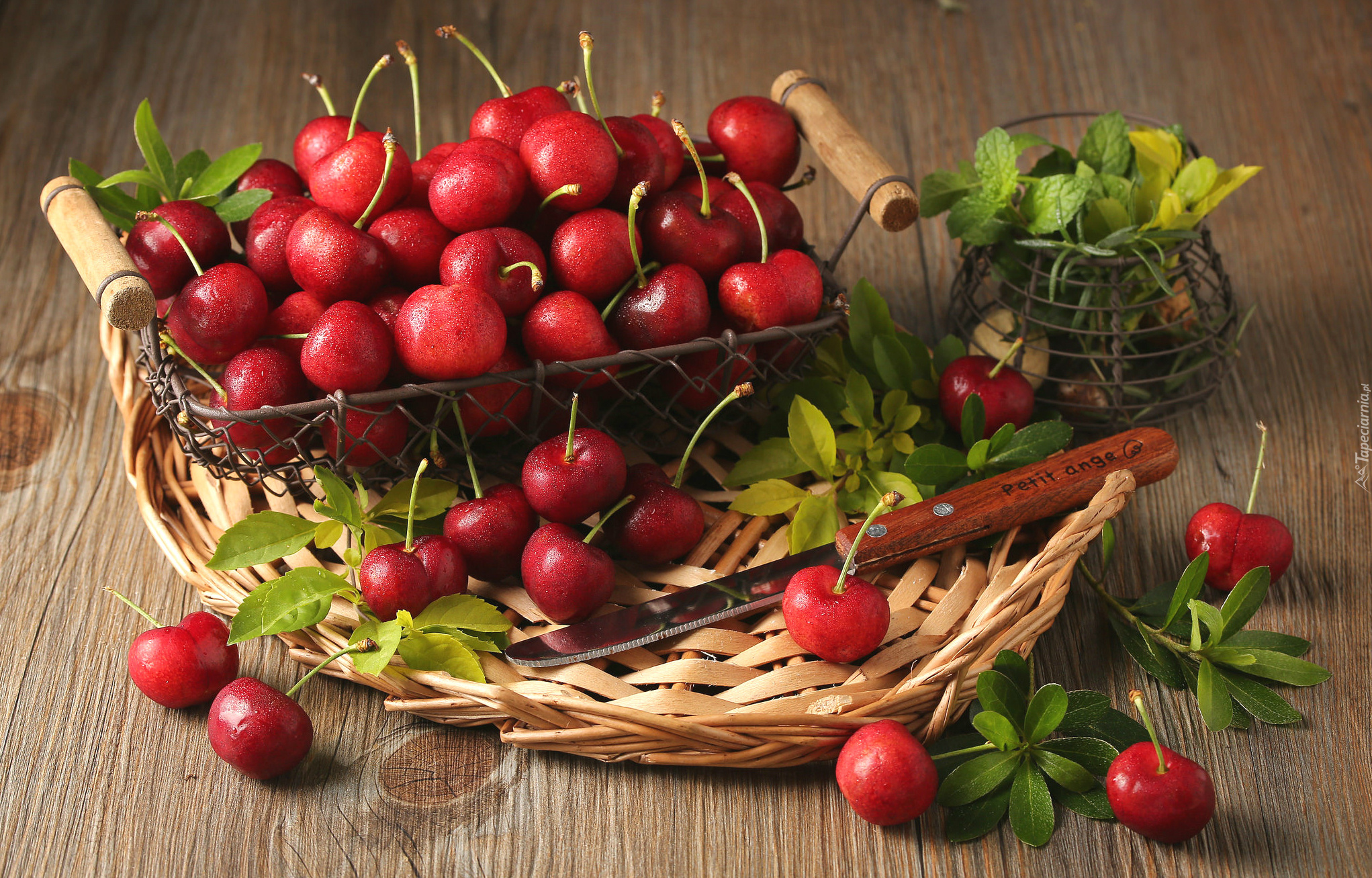 Edytor tapety: Czereśnie w koszyku i na słomianej podkładce