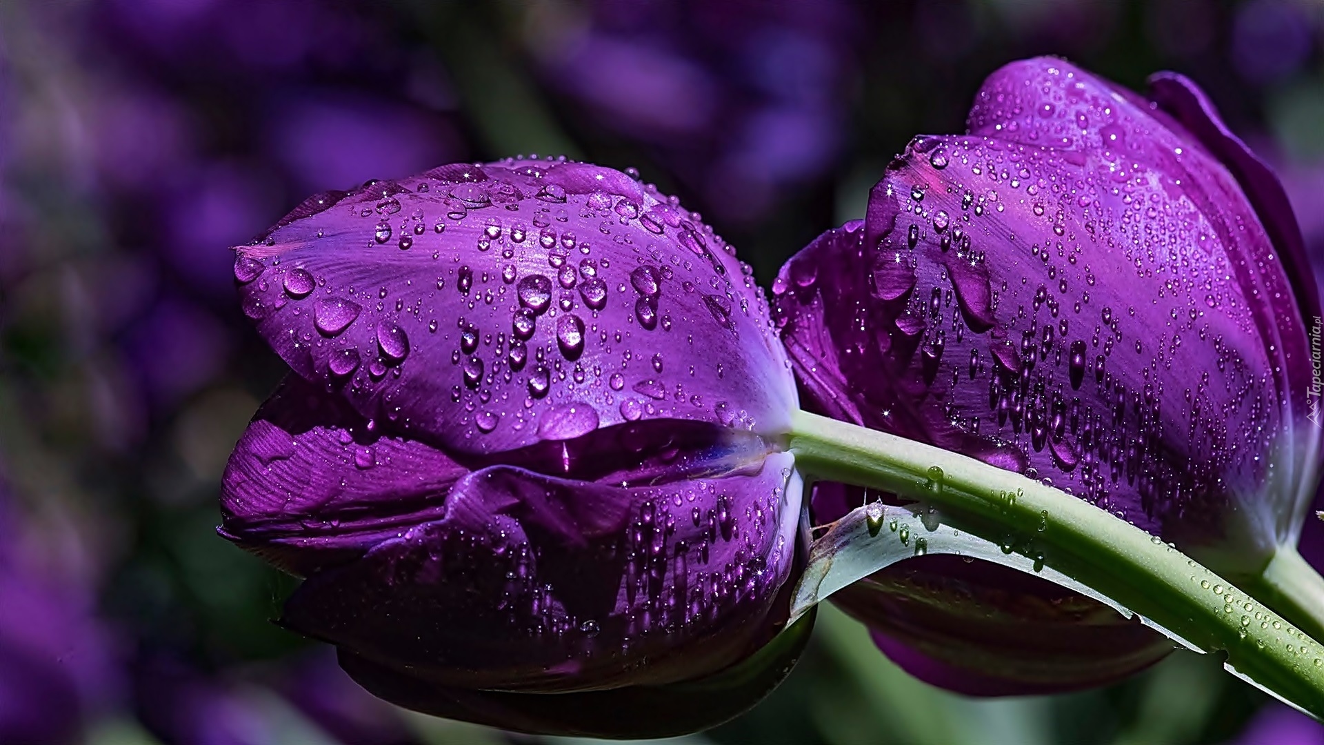Edytor tapety: Krople wody na płatkach fioletowych tulipanów