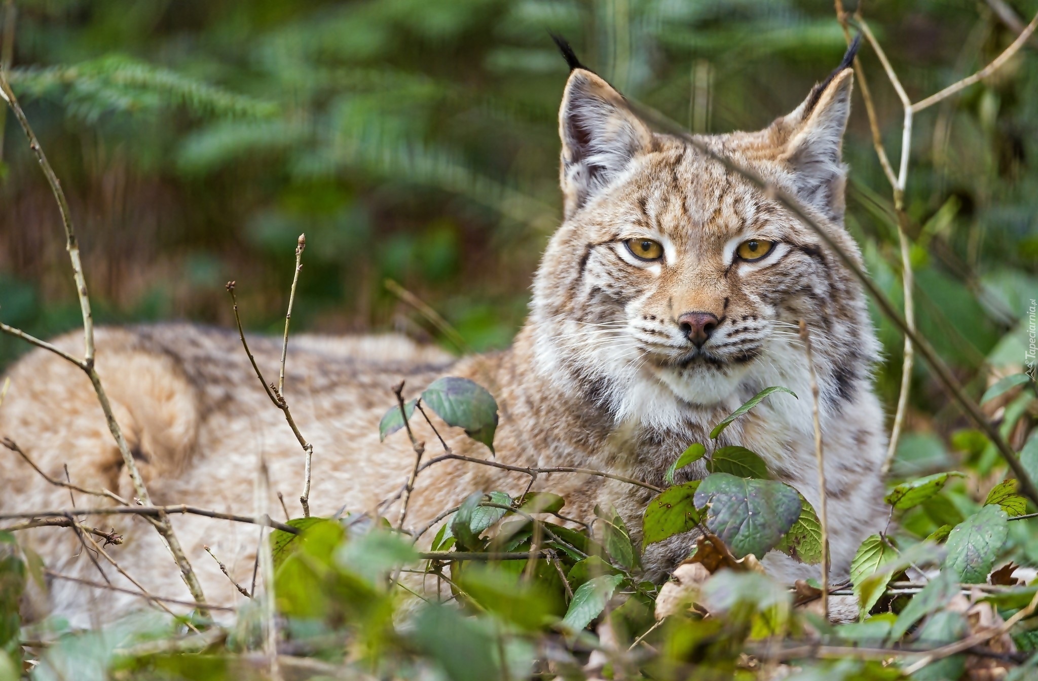 Edytor tapety: Ryś wyleguje się wśród gałązek
