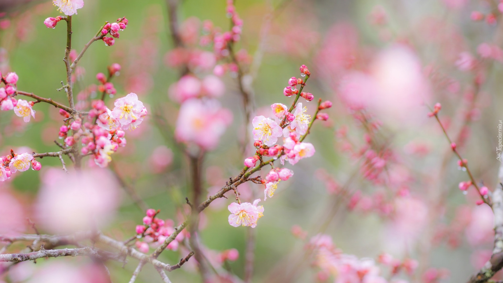 Edytor tapety: Krople deszczu na kwiatach drzewa owocowego w rozmyciu