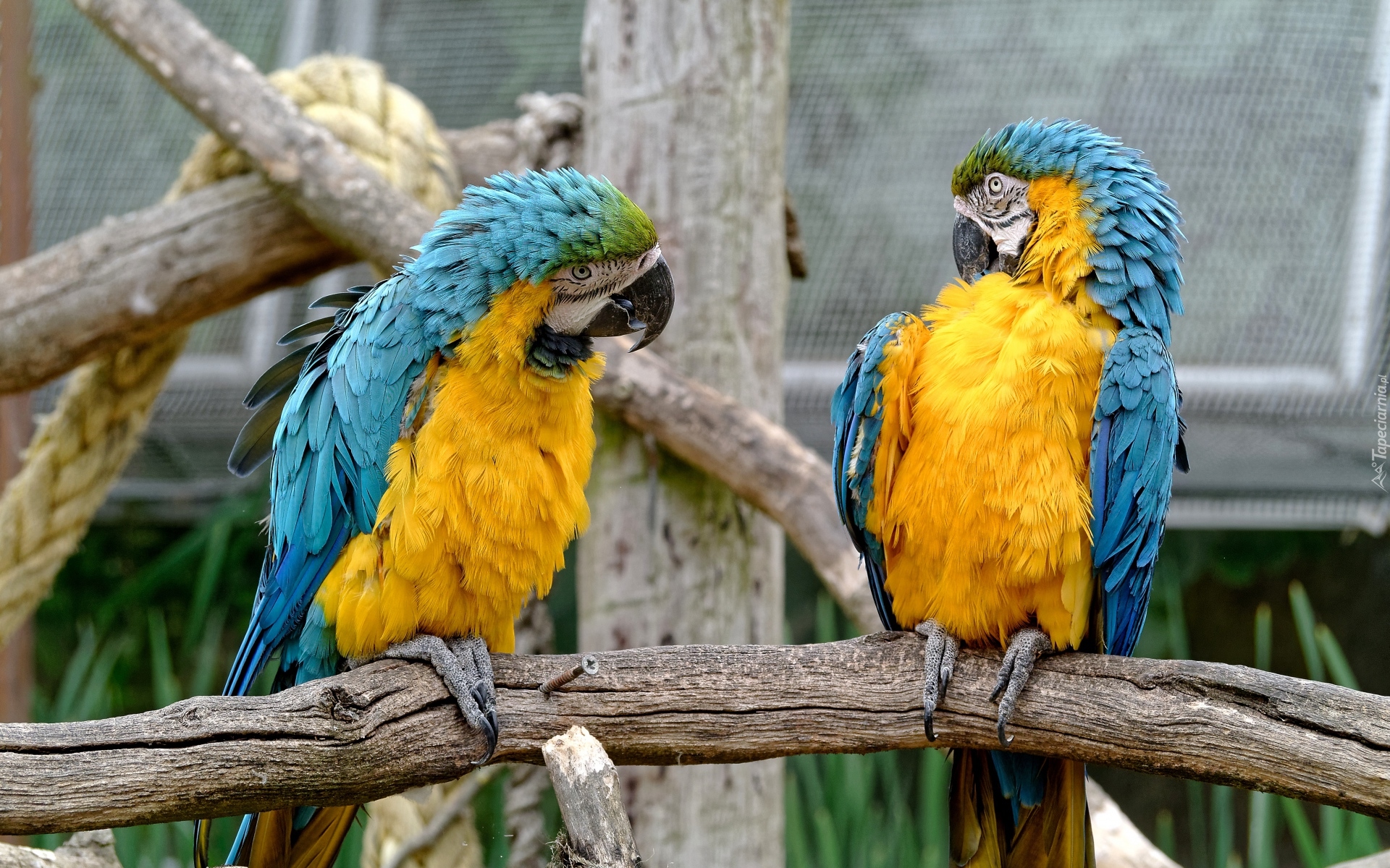 Edytor tapety: Dwie niebiesko-żółte ary na gałęzi