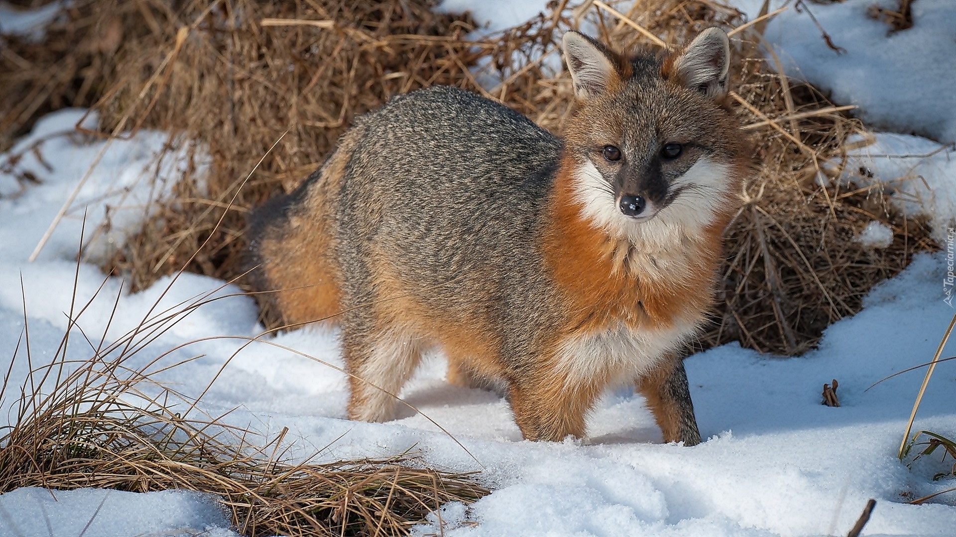 Edytor tapety: Lis na śniegu wśród suchych traw