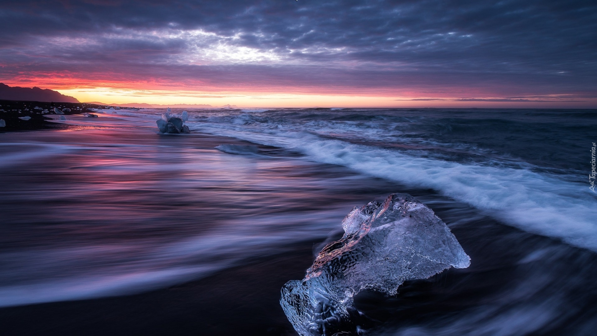 Edytor tapety: Bryły lodu na morskiej plaży o zachodzie słońca
