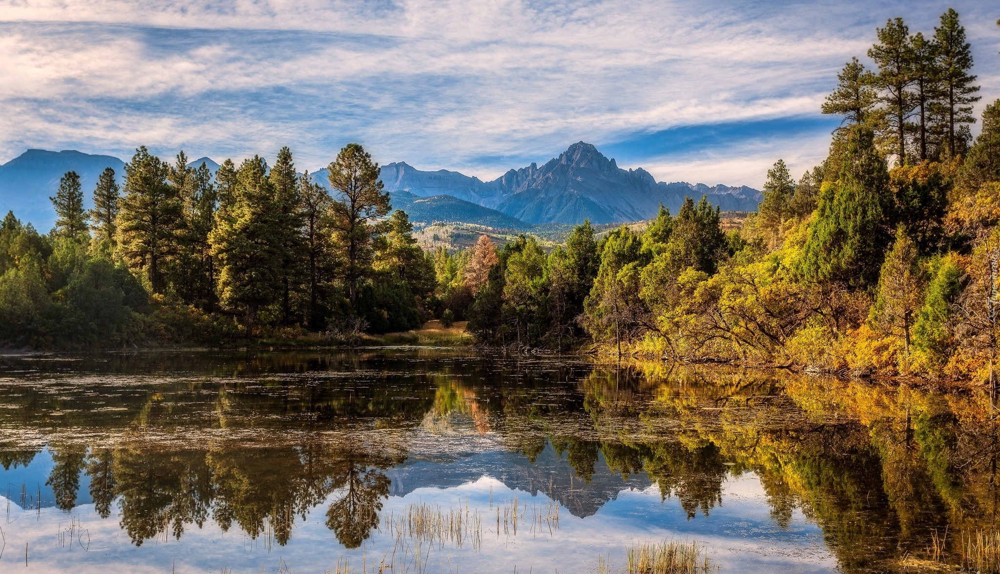Edytor tapety: Krajobraz z rzeką, drzewami i górami w oddali