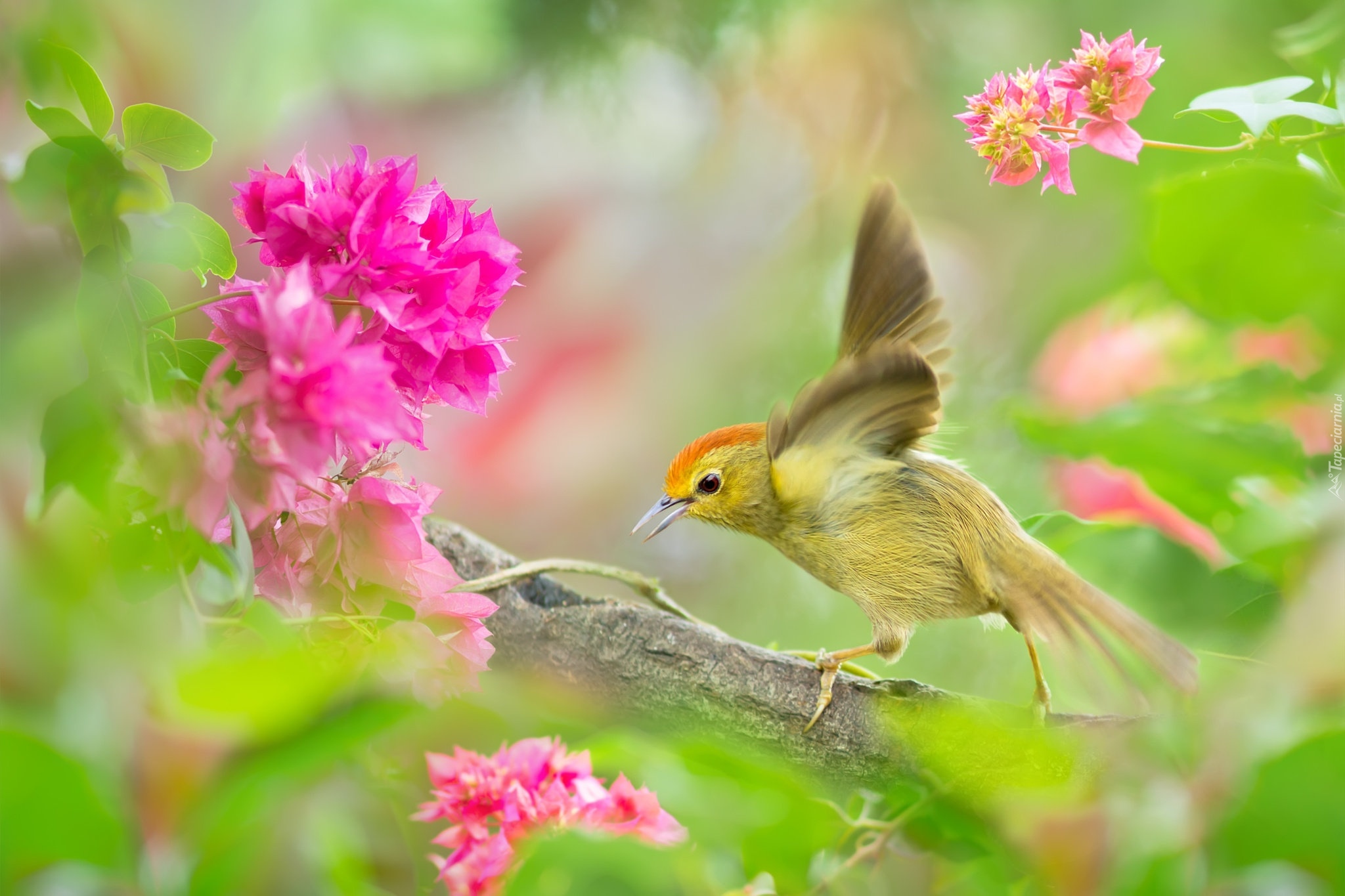 Edytor tapety: Ptaszek przyleciał na gałązkę wiosennego drzewa