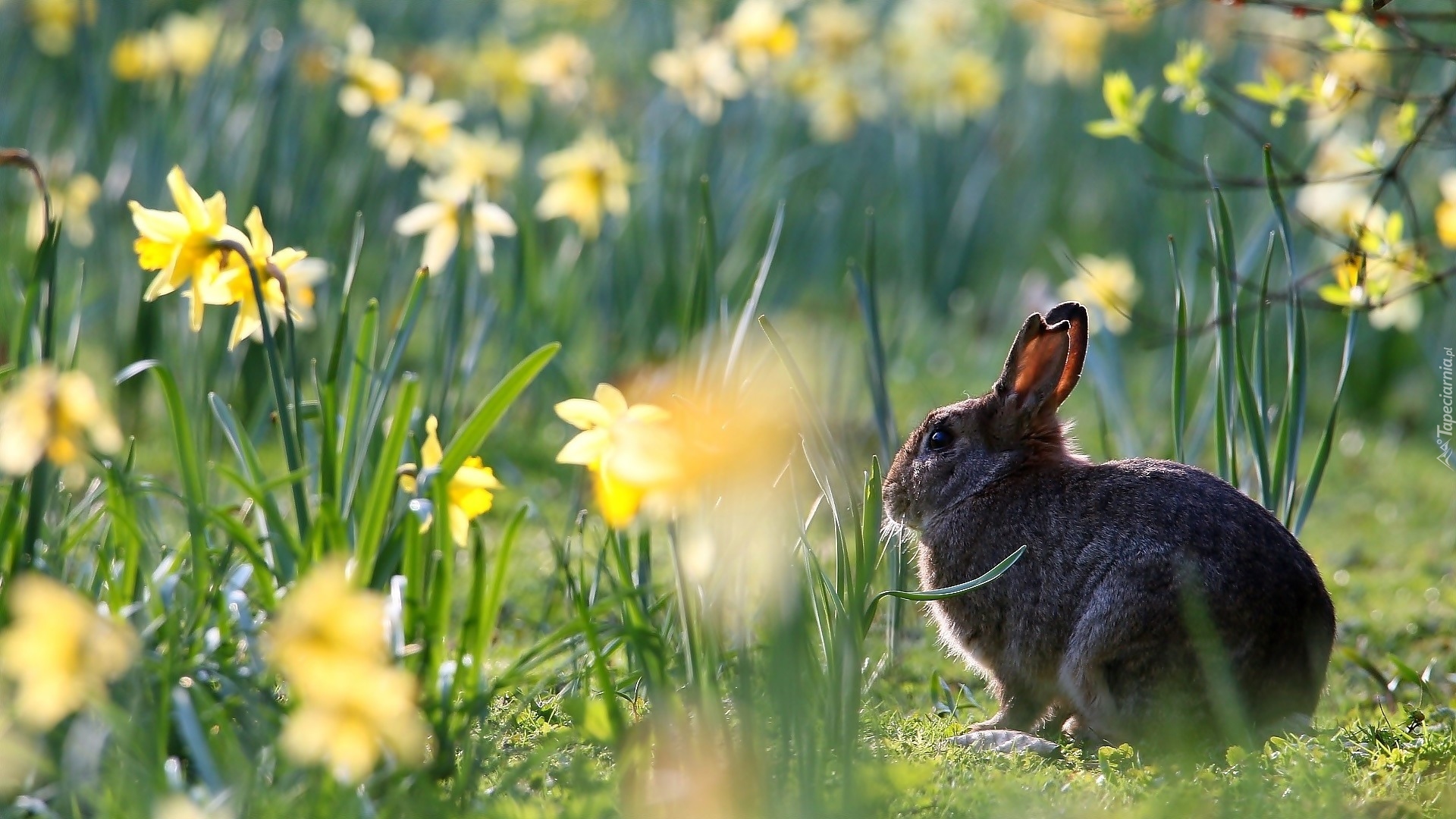 Edytor tapety: Królik pomiędzy żonkilami w rozmyciu