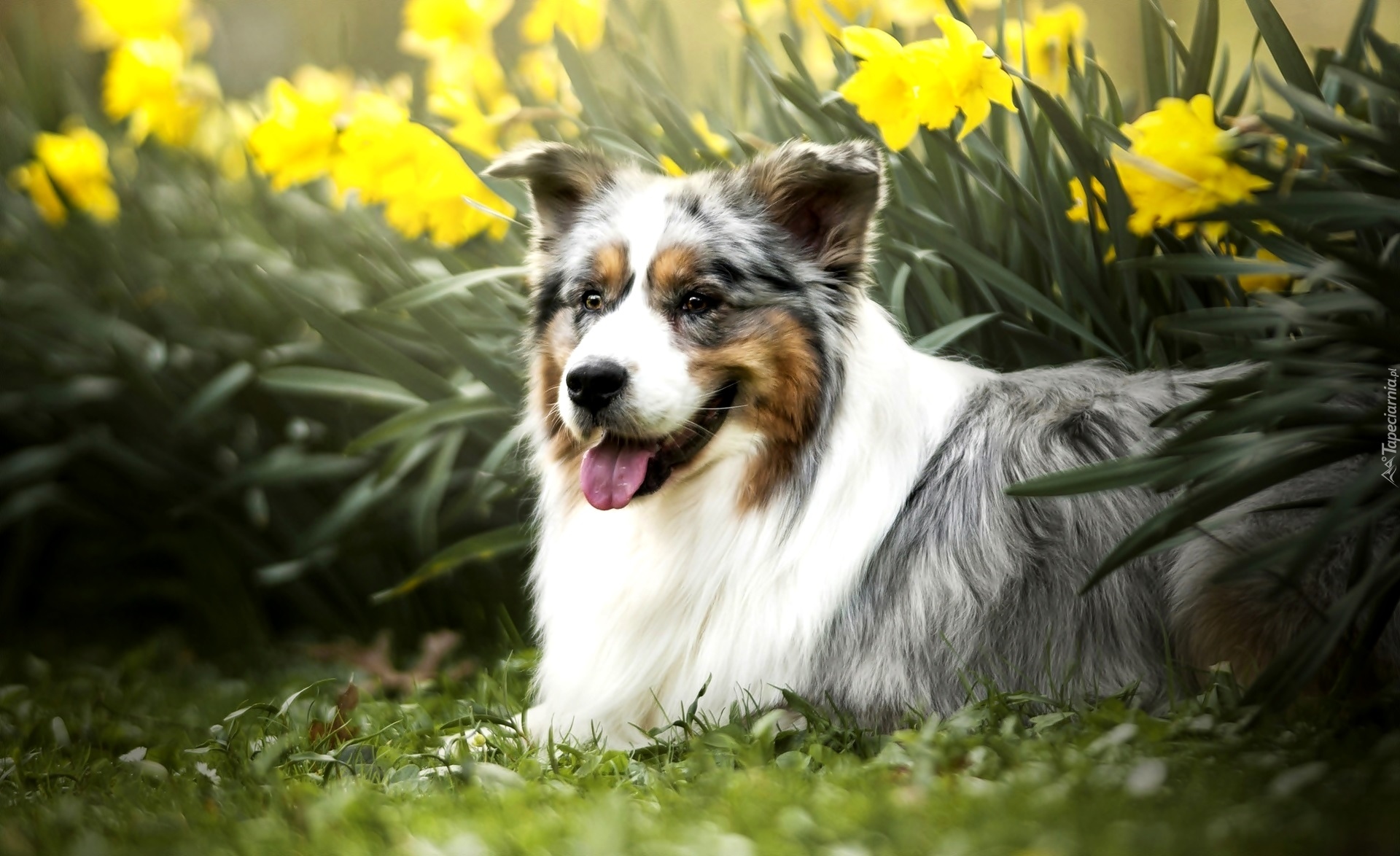 Edytor tapety: Owczarek australijski leży na trawie wśród żonkili