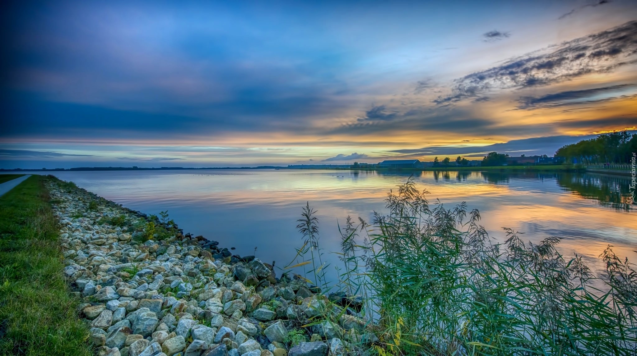 Edytor tapety: Kamienie i roślinność nad brzegiem rzeki