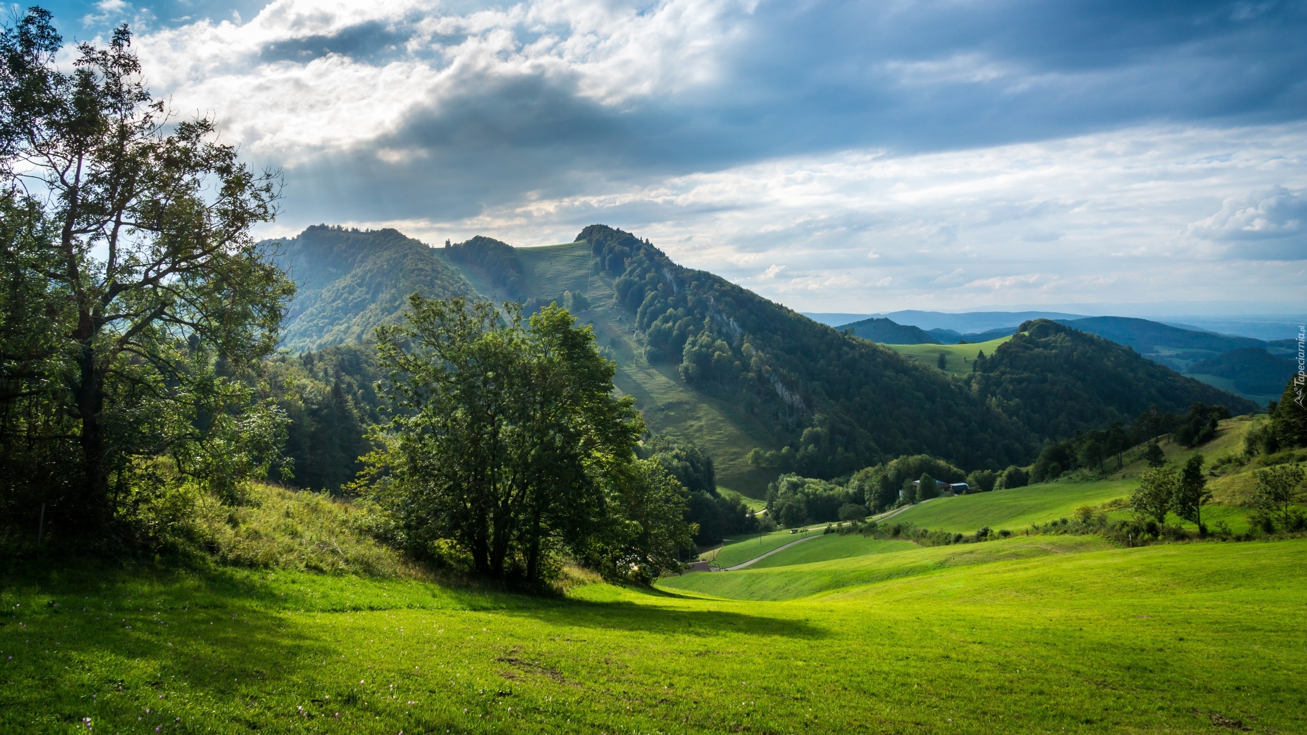 Edytor tapety: Łąka z widokiem na drzewa i góry