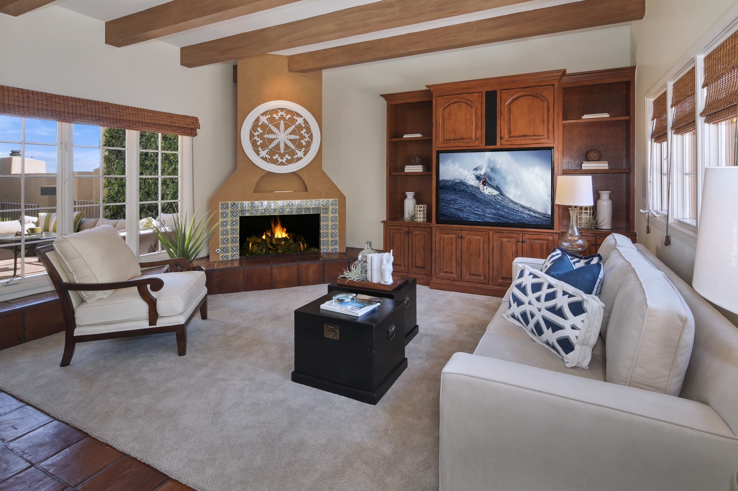 Edytor tapety: Umeblowany salon z kominkiem i widokiem na taras