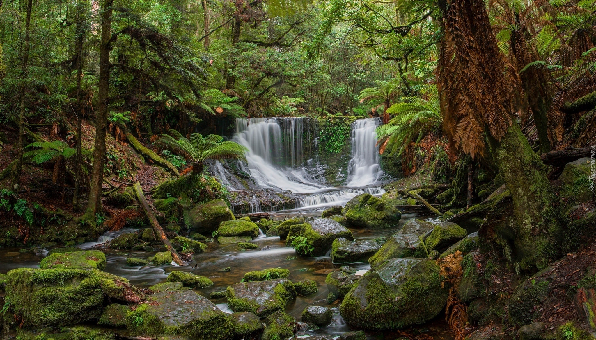 Edytor tapety: Mały leśny wodospad spływający po omszałych kamieniach
