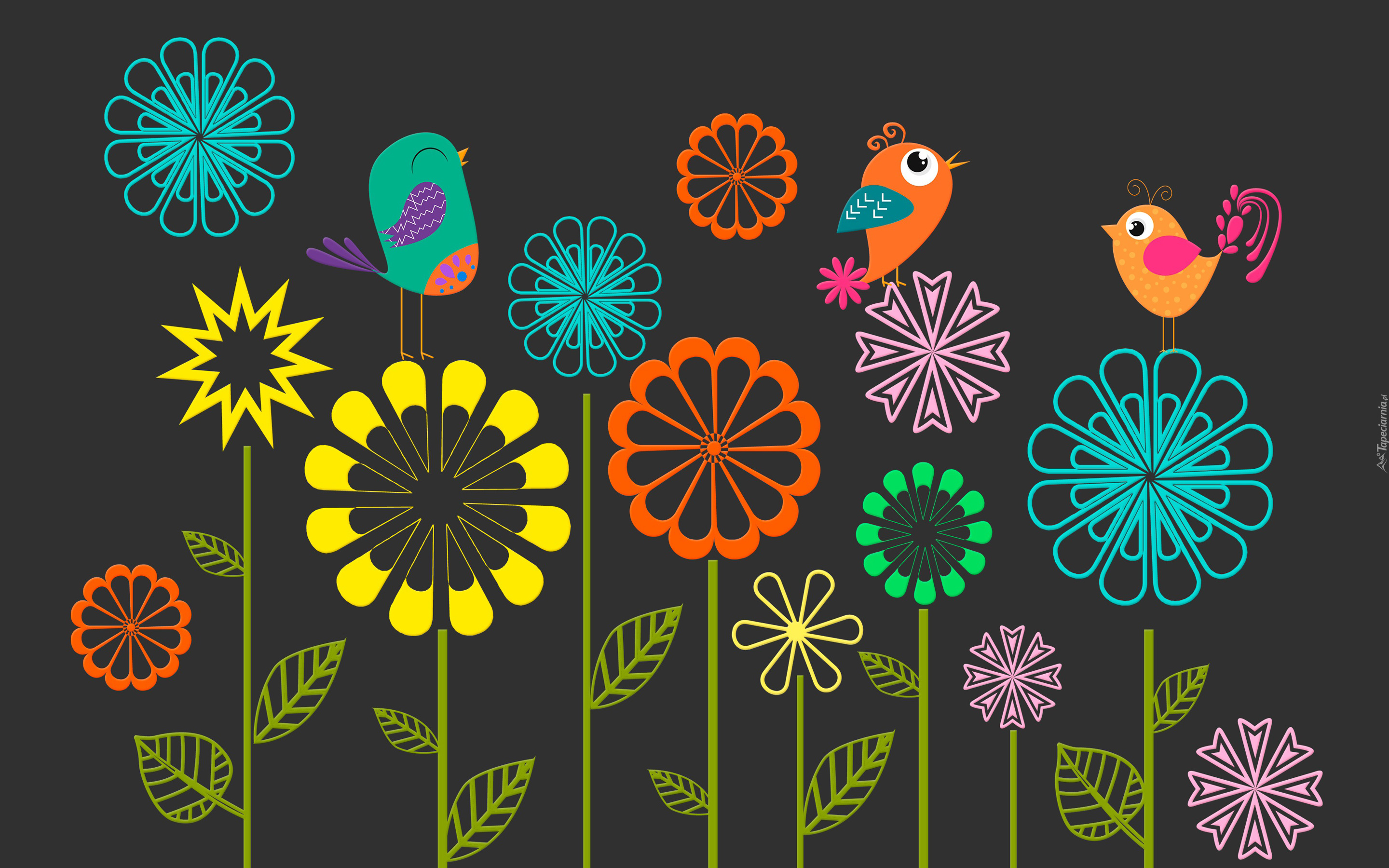 Edytor tapety: Kolorowe kwiaty i ptaki w grafice 2D