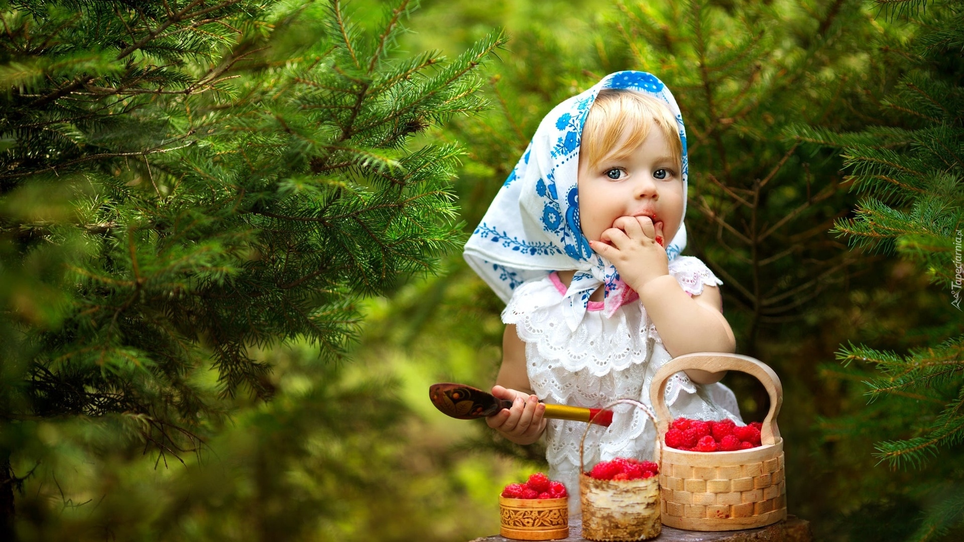 Edytor tapety: Dziewczynka w chustce zajada maliny uzbierane do koszyczków