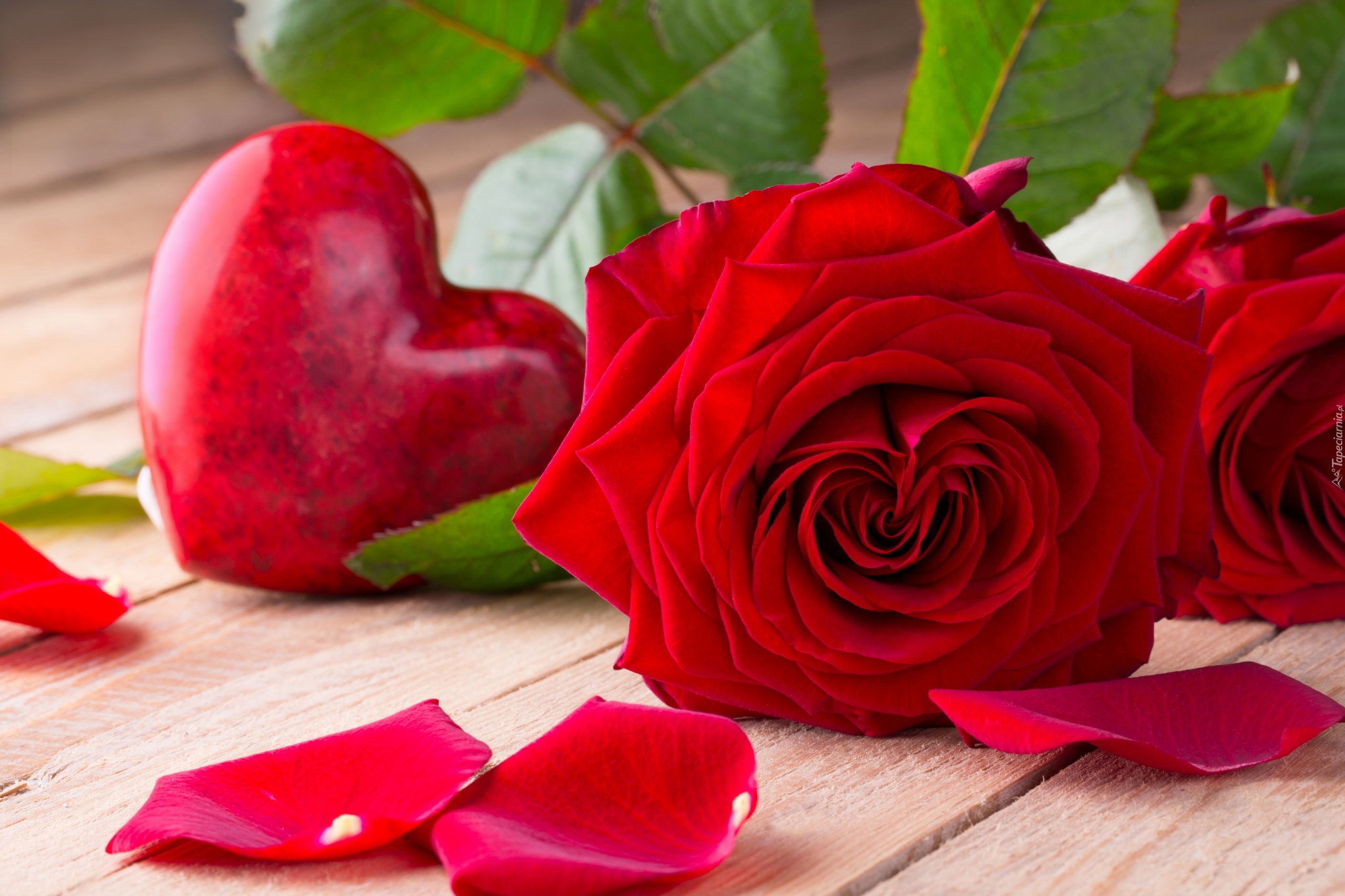 Edytor tapety: Serce obok czerwonej róży i rozsypanych płatków