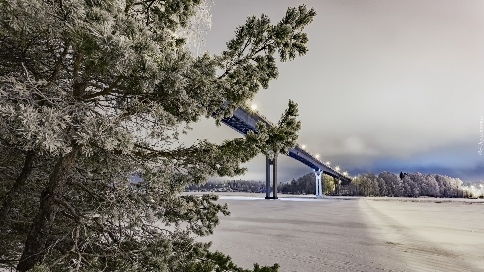 Edytor tapety: Most nad oblodzoną rzeką w zimowej scenerii