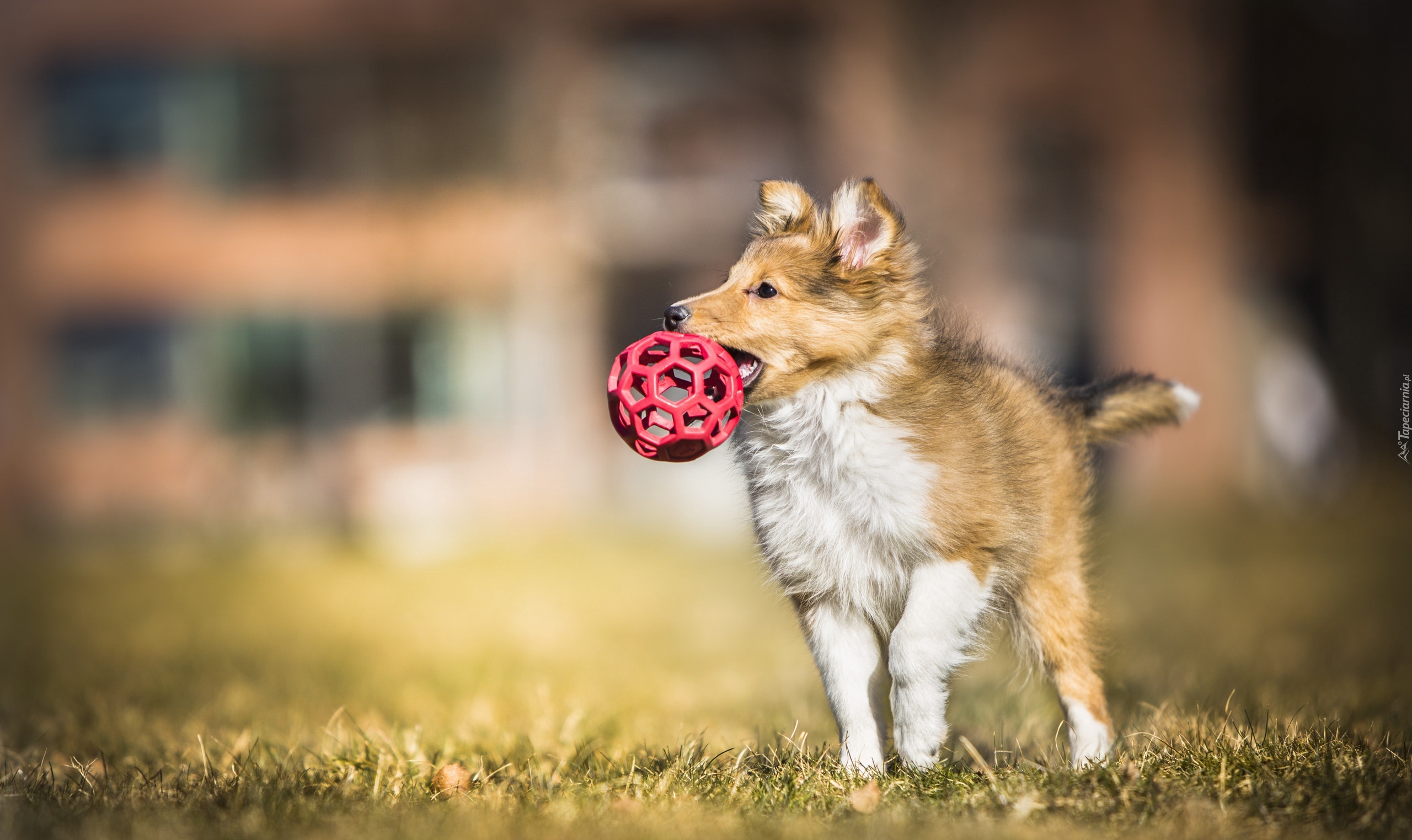 Edytor tapety: Szczeniak owczarka szetlandzkiego z piłeczką w pyszczku