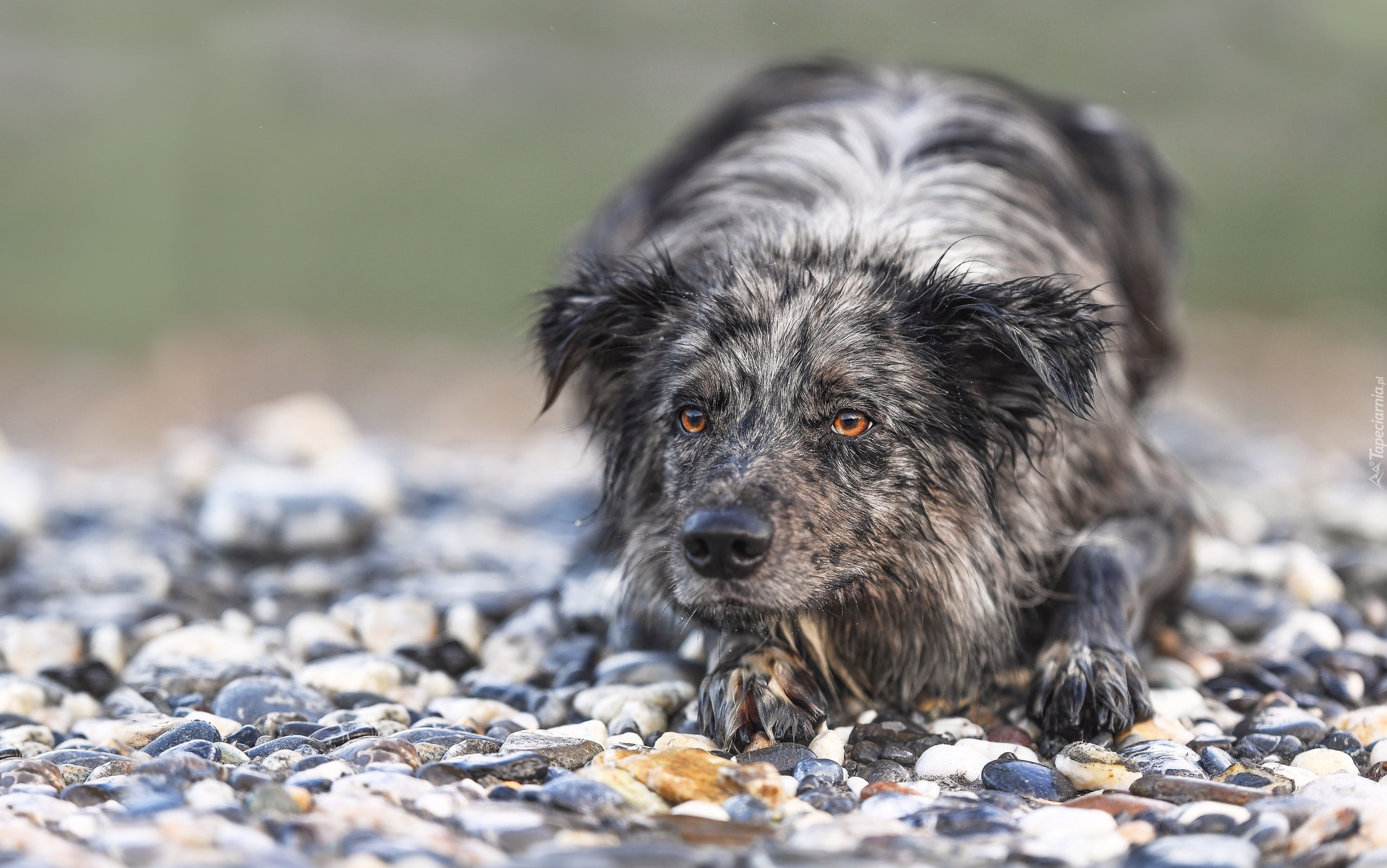 Edytor tapety: Zmoknięty border collie na kamieniach