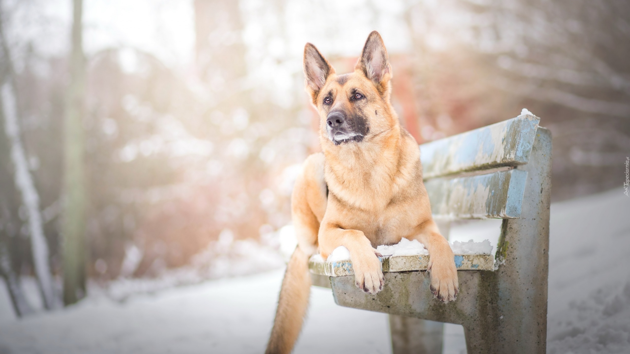 Edytor tapety: Owczarek niemiecki leży na ośnieżonej ławce