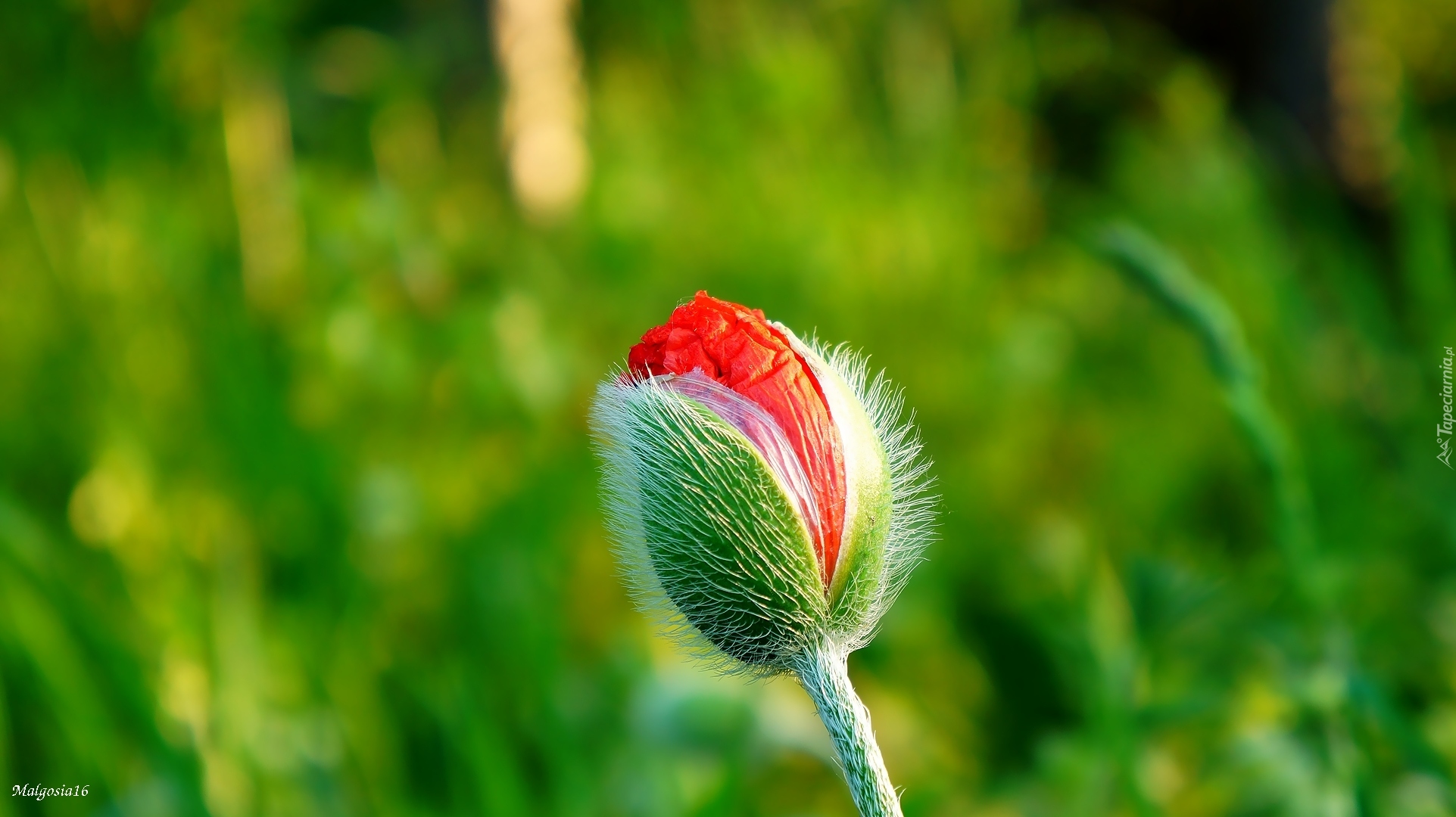 Edytor tapety: Rozkwitający pąk czerwonego maku na rozmytym tle