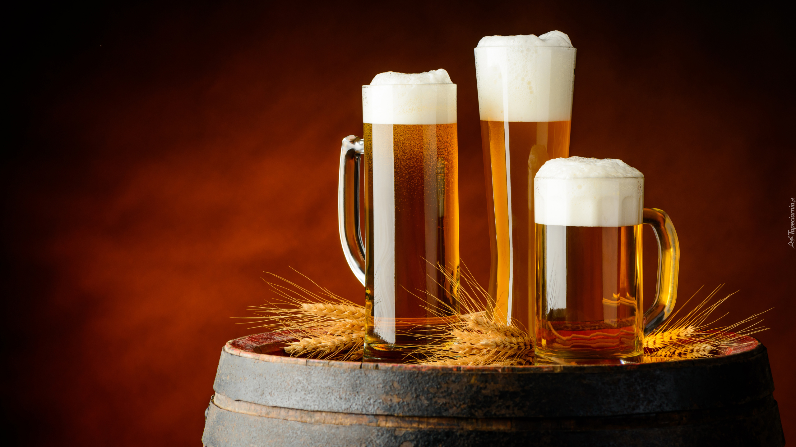 Edytor tapety: Kłosy pszenicy między kuflami z piwem na beczce