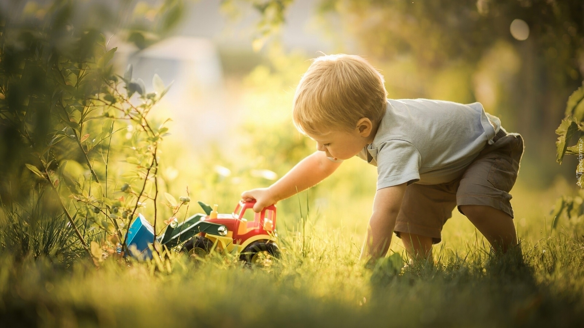 Edytor tapety: Chłopczyk bawi się samochodem zabawką w trawie