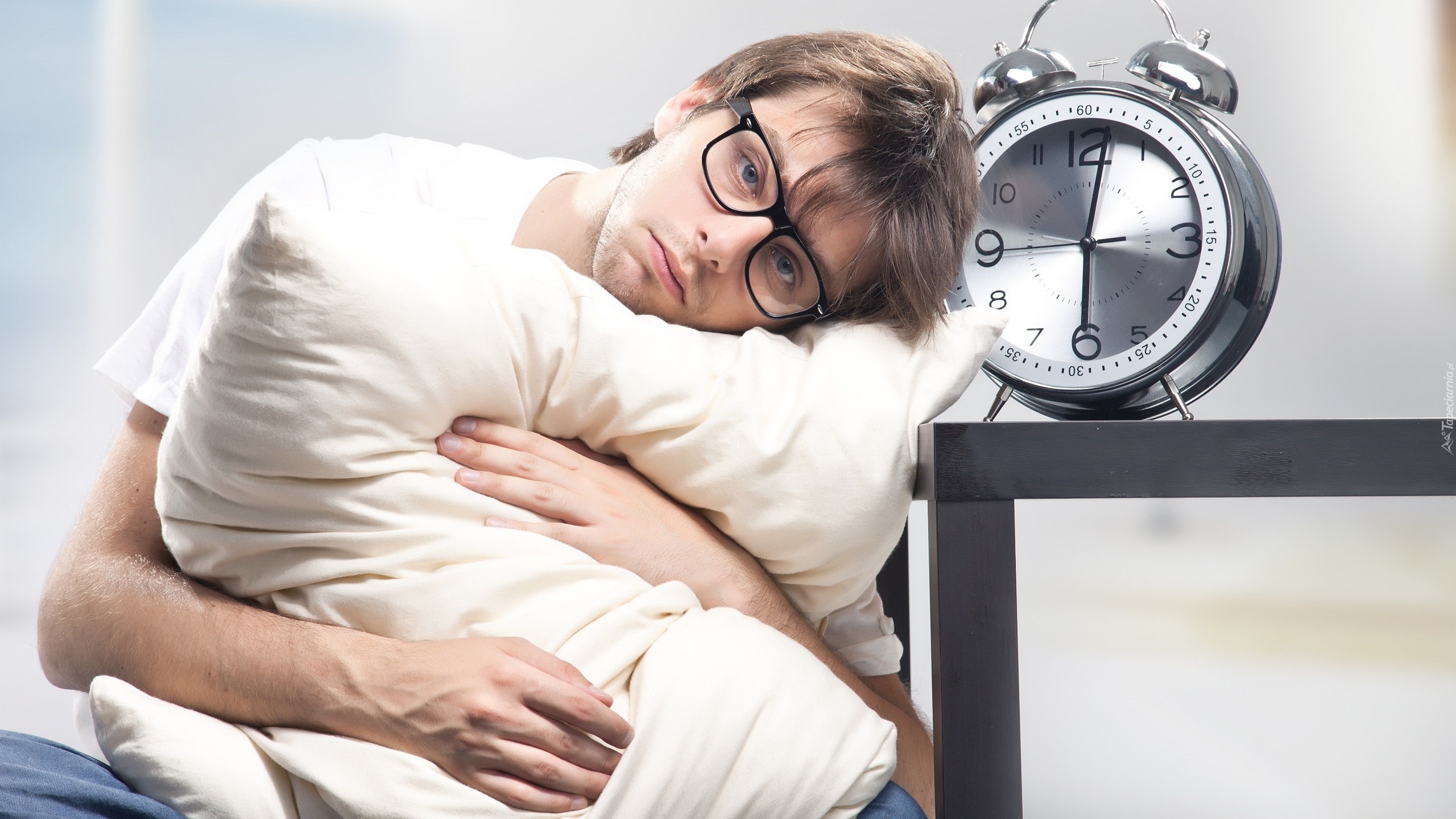 Edytor tapety: Mężczyzna z poduszką obudzony przez budzik