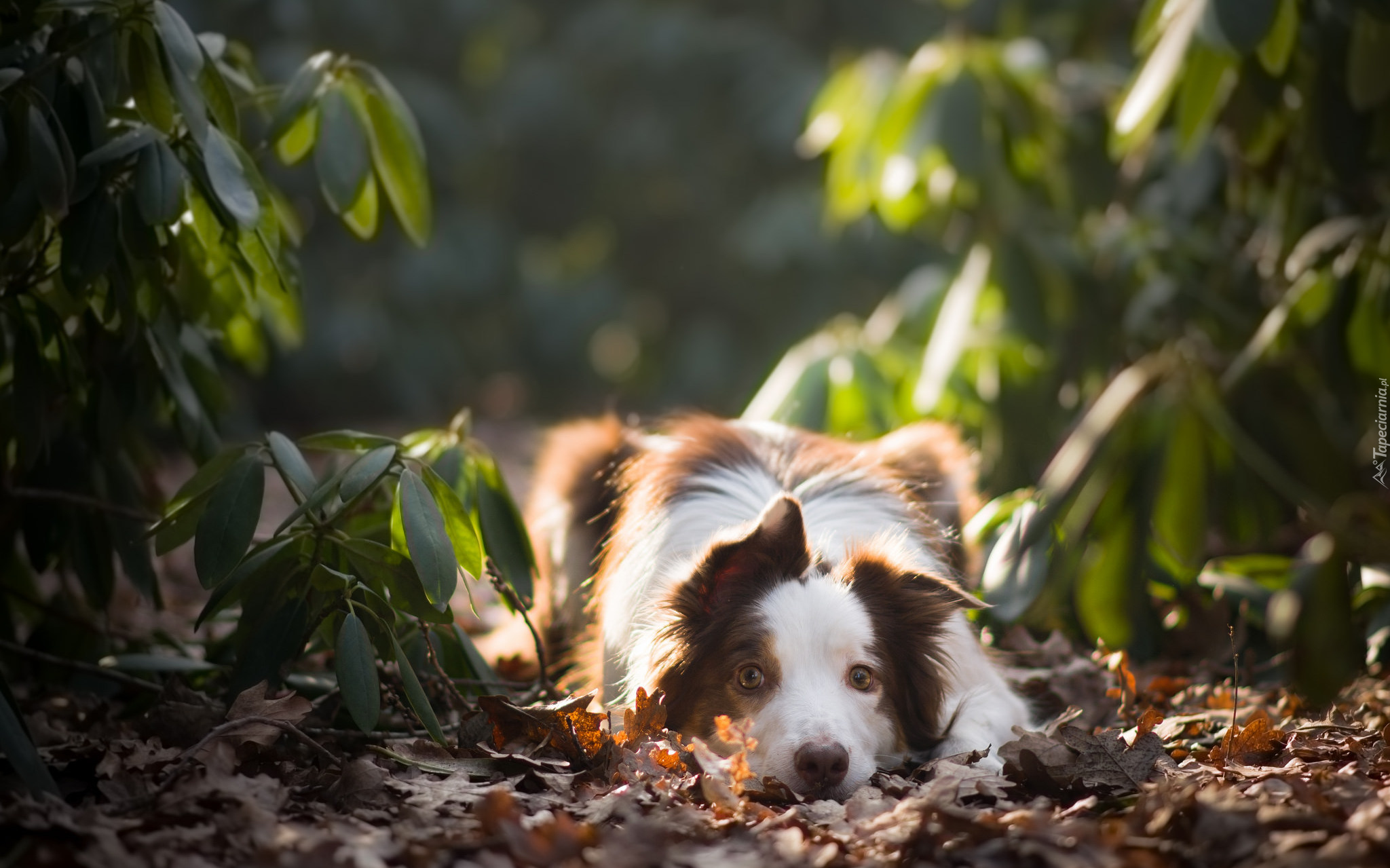 Edytor tapety: Border collie leży pośród roślin i suchych liści