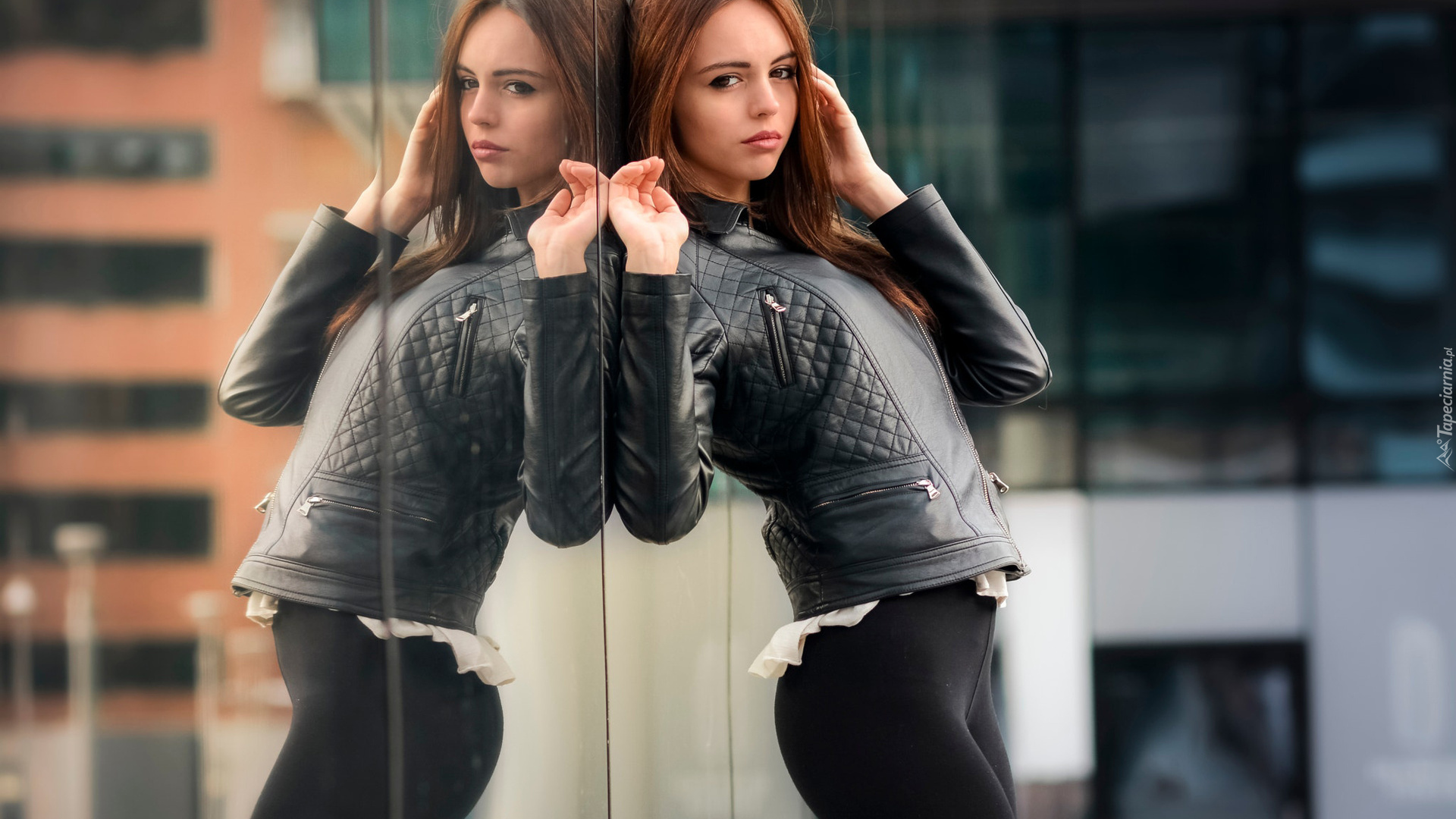 Edytor tapety: Dziewczyna w skórzanej kurtce odbijająca się w lustrze
