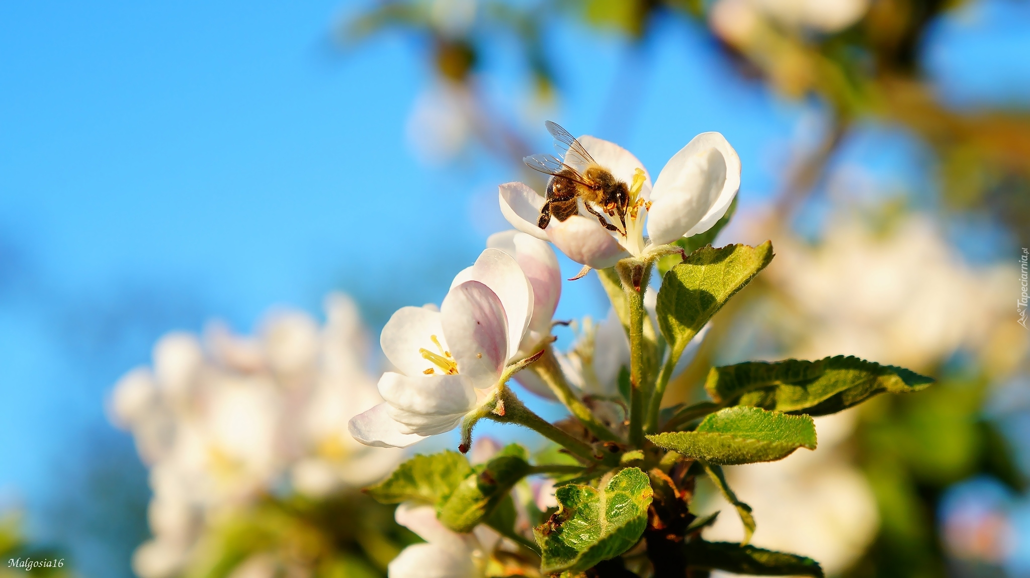 Edytor tapety: Pszczoła przysiadła na kwiatku drzewa owocowego