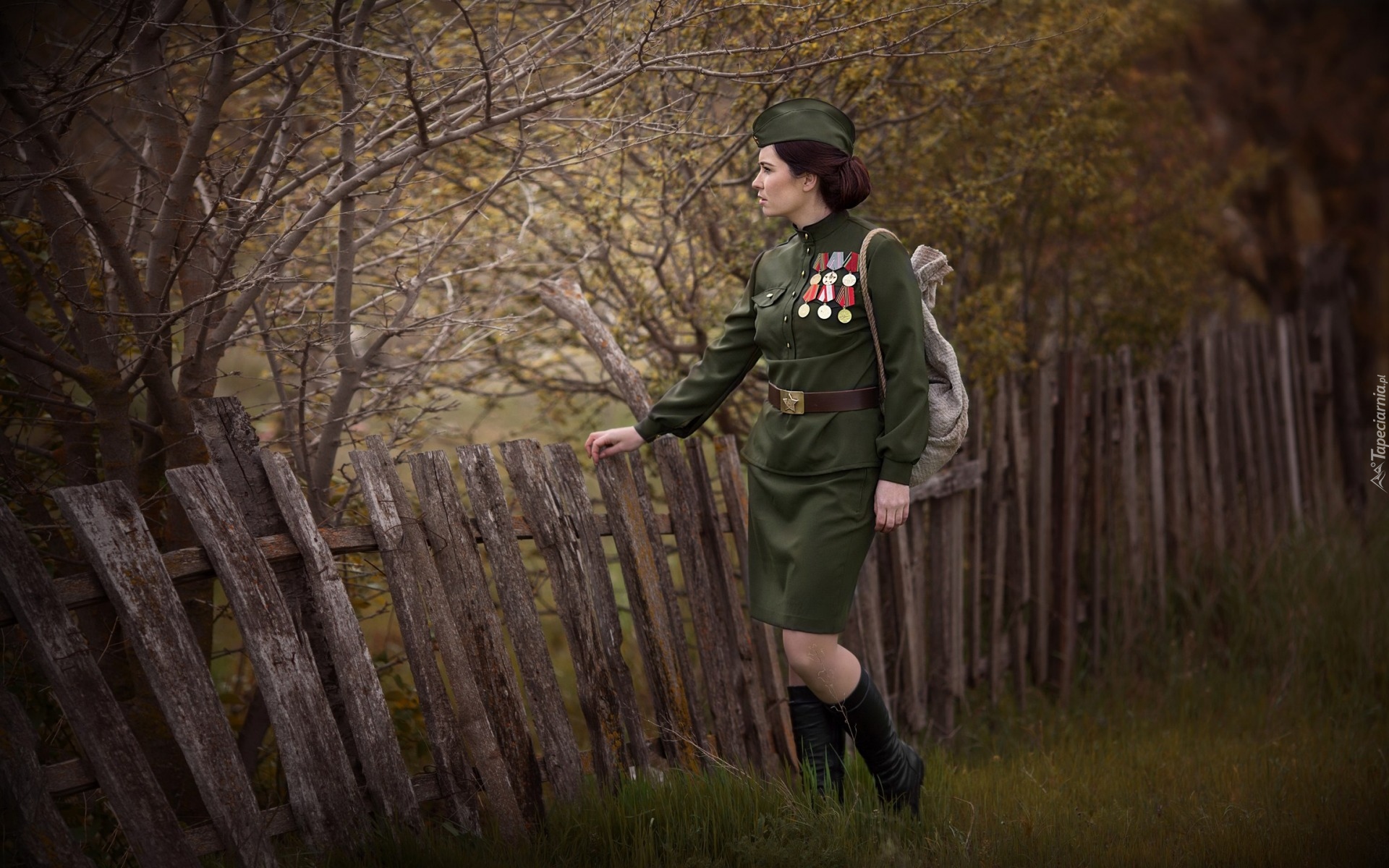 Edytor tapety: Kobieta w mundurze z odznaczeniami przy drewnianym płocie