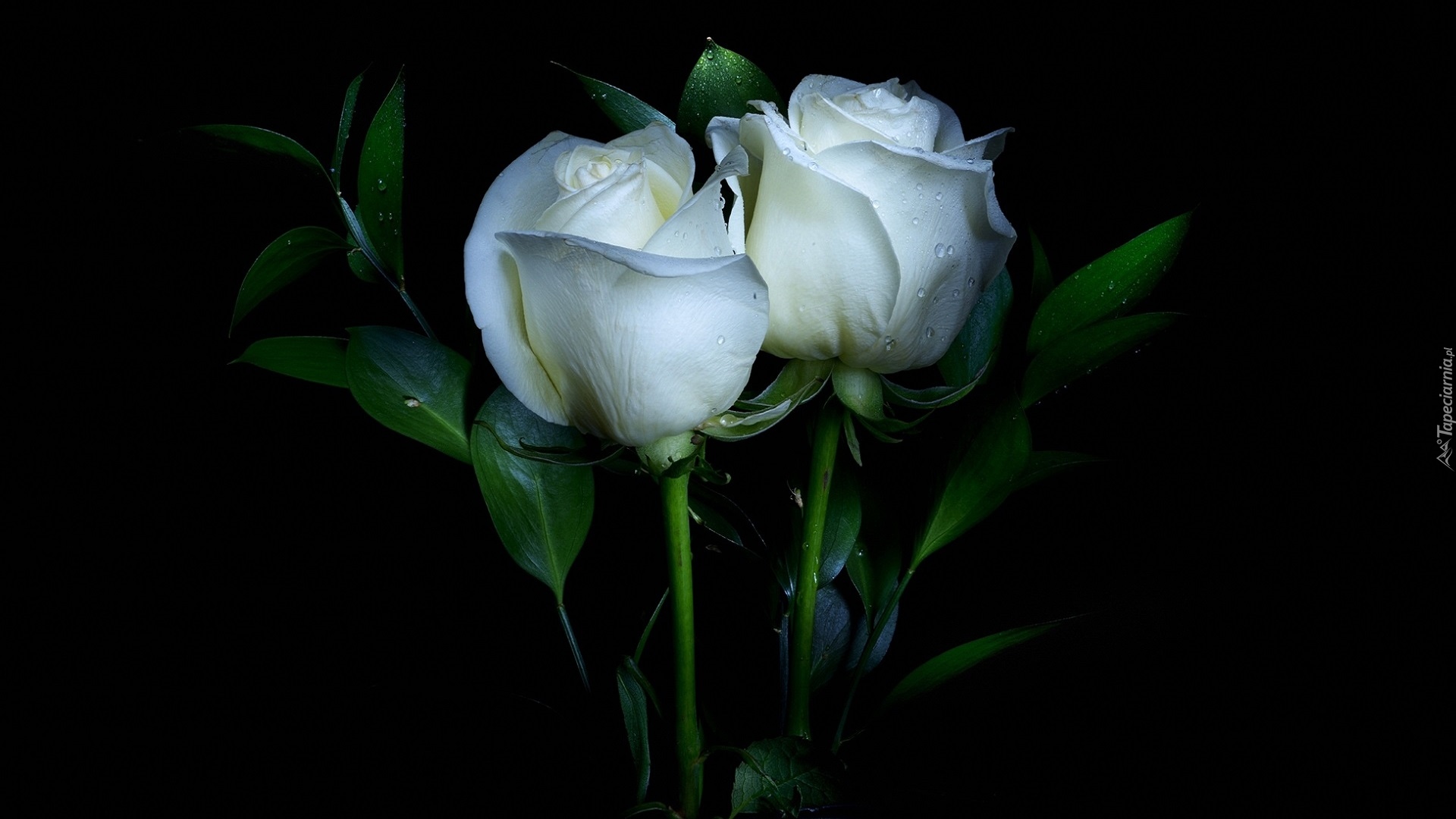 Edytor tapety: Białe róże w kroplach wody na czarnym tle