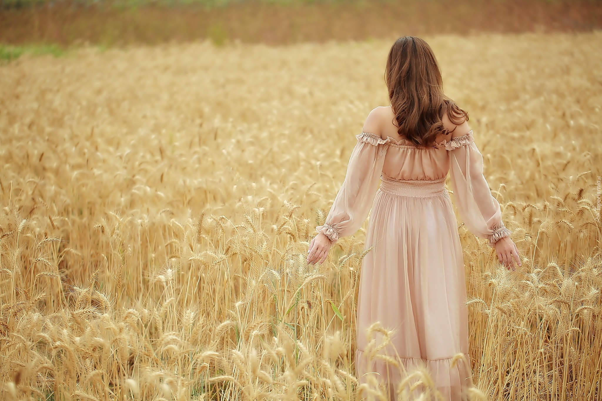 Edytor tapety: Kobieta spaceruje po polu porośniętym pszenicą