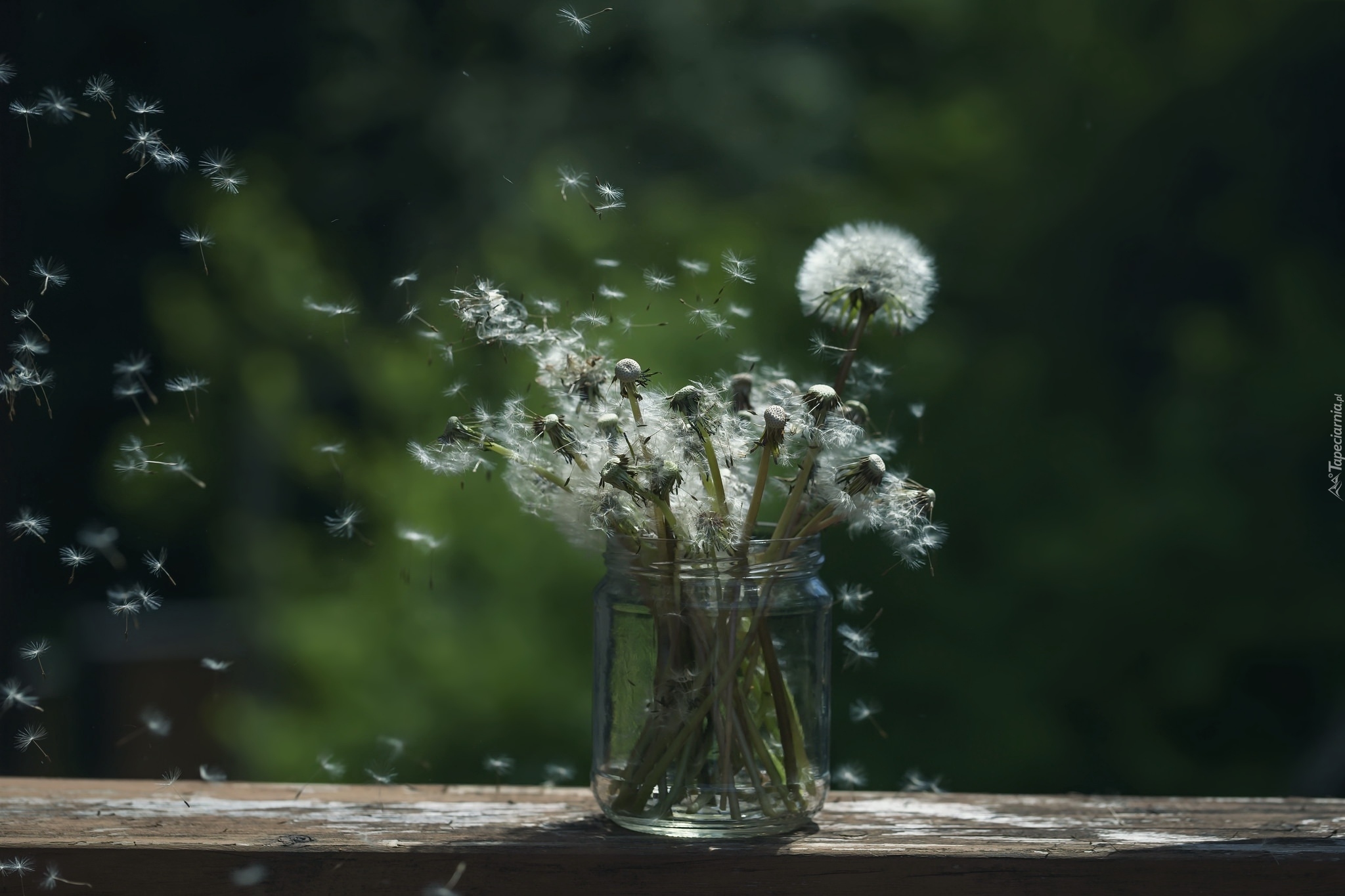 Edytor tapety: Fruwające niełupki obok słoika z dmuchawcami